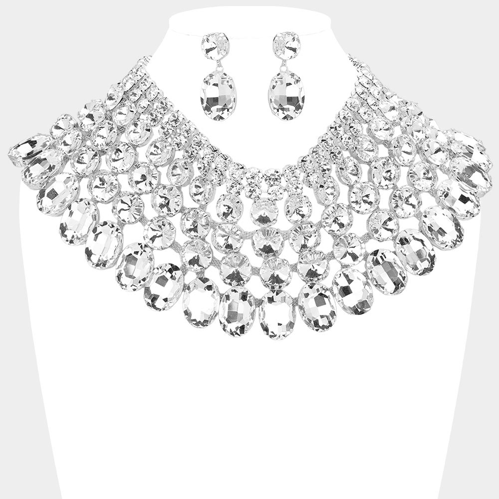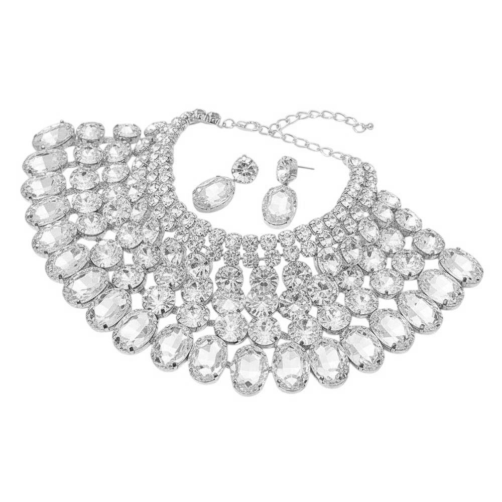 Details • Necklace Size: 13" + 4" L • Decor Size: 3.7" L • Earring Size: 1.75" L • Dramatic bib necklace and earring set featuring layered oval stones arranged in a bold cascading design. Perfect for weddings, galas, performances or any occasion that calls for standout glamour. An eye-catching accessory set that elevates formal and evening looks.
