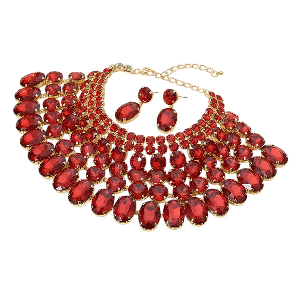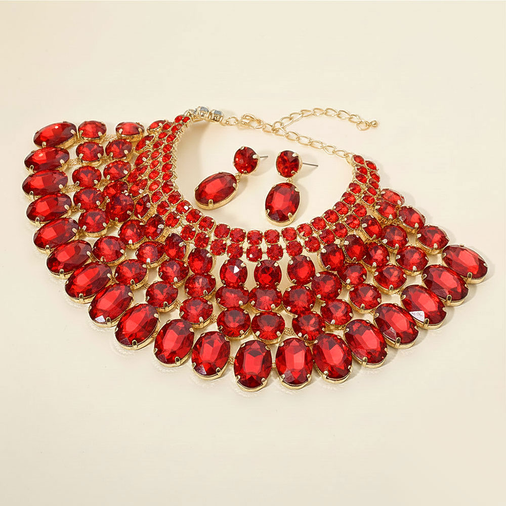 • Dramatic bib necklace and earring set featuring layered oval stones arranged in a bold cascading design. Perfect for weddings, galas, performances or any occasion that calls for standout glamour. An eye-catching accessory set that elevates formal and evening looks.