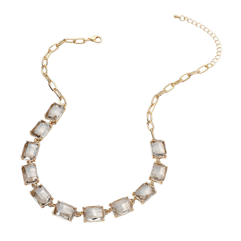 • This elegant gemstone chain necklace features a row of precisely cut stones linked with a sleek chain for a refined, modern look. Its adjustable closure ensures a comfortable fit, making it a sophisticated accessory for formal occasions, evening wear, or adding a statement touch to everyday style.