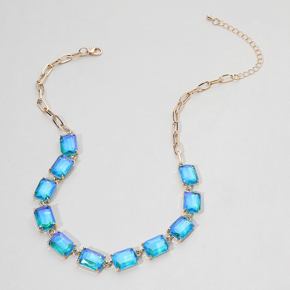 • This elegant gemstone chain necklace features a row of precisely cut stones linked with a sleek chain for a refined, modern look. Its adjustable closure ensures a comfortable fit, making it a sophisticated accessory for formal occasions, evening wear, or adding a statement touch to everyday style.