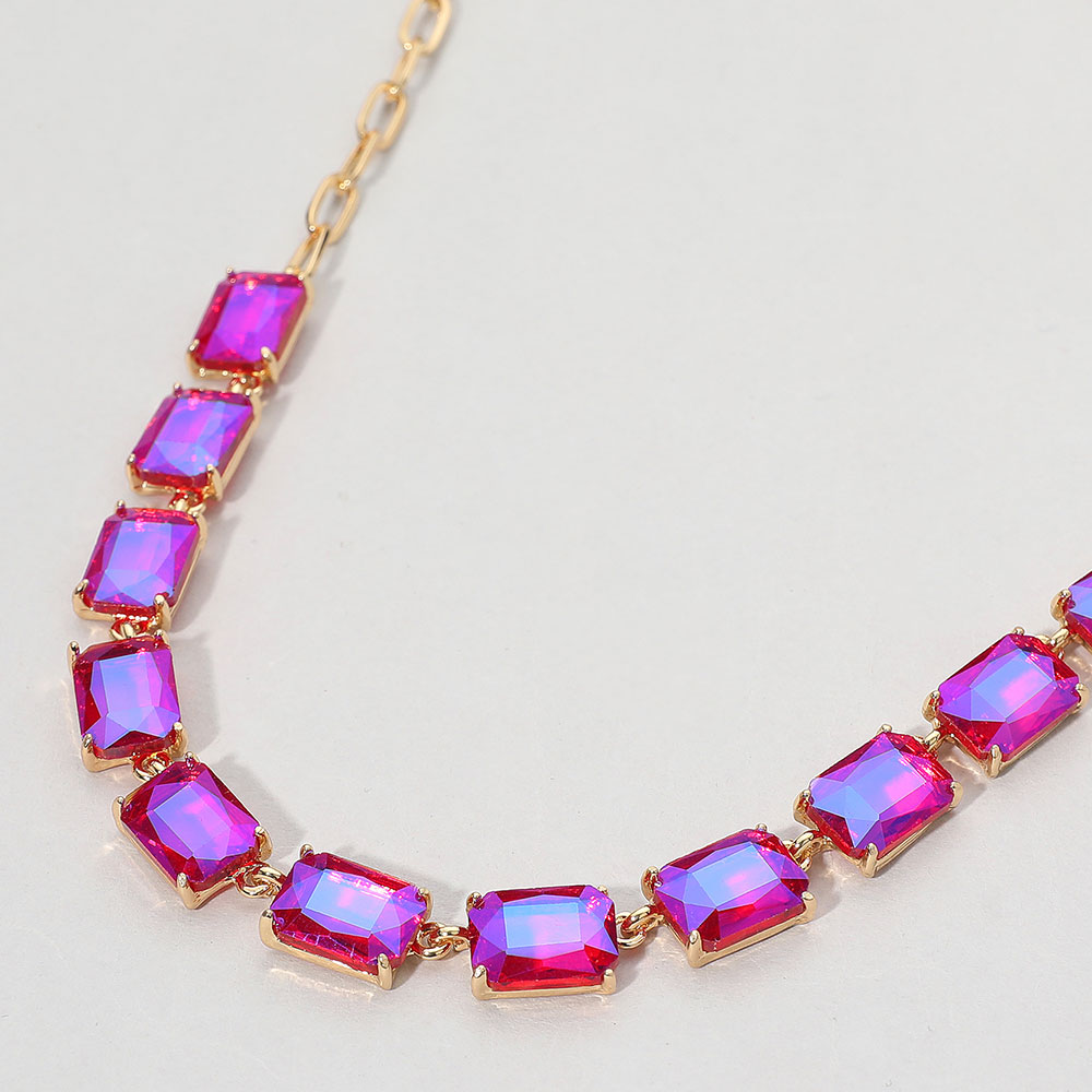 Details • Necklace Size : 16" + 2.5" L • Decor Size : 0.4" L • This elegant gemstone chain necklace features a row of precisely cut stones linked with a sleek chain for a refined, modern look. Its adjustable closure ensures a comfortable fit, making it a sophisticated accessory for formal occasions, evening wear, or adding a statement touch to everyday style. • Lead and Nickel Compliant