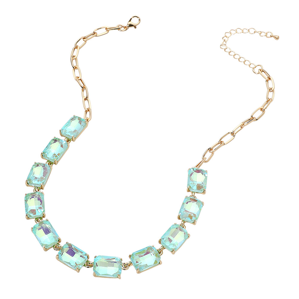 • This elegant gemstone chain necklace features a row of precisely cut stones linked with a sleek chain for a refined, modern look. Its adjustable closure ensures a comfortable fit, making it a sophisticated accessory for formal occasions, evening wear, or adding a statement touch to everyday style.