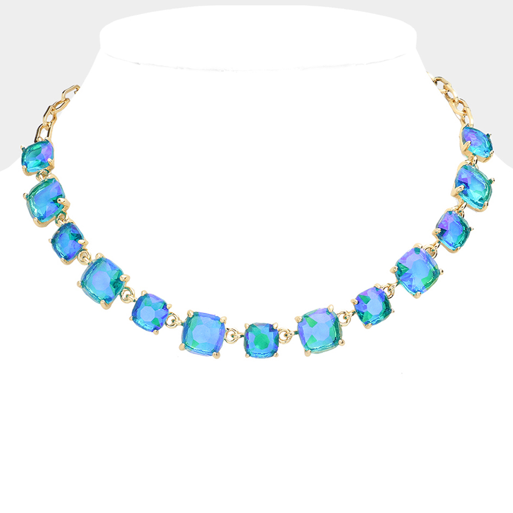 • Elevate your style with this stunning square cut gemstone statement necklace. Featuring shimmering faceted stones linked in a classic design, it offers a chic adjustable fit. Perfect for evening wear, weddings, parties, or adding a sophisticated sparkle to your everyday look.