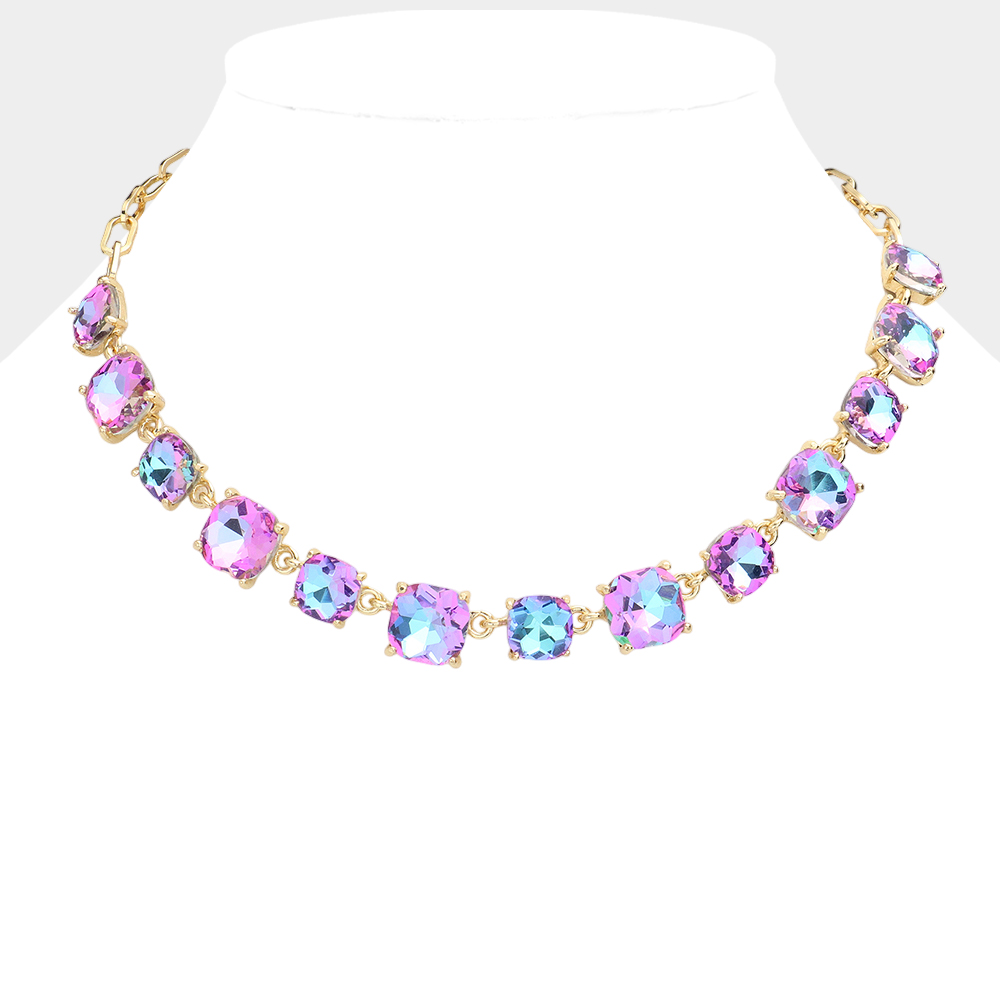 • Elevate your style with this stunning square cut gemstone statement necklace. Featuring shimmering faceted stones linked in a classic design, it offers a chic adjustable fit. Perfect for evening wear, weddings, parties, or adding a sophisticated sparkle to your everyday look.
