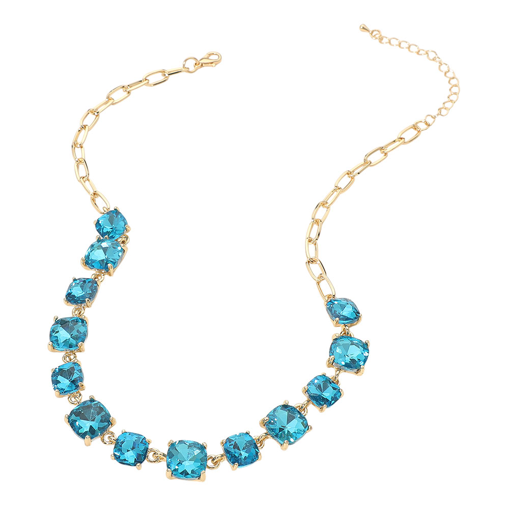 Details • Necklace Size : 16" + 2.75" L • Decor Size : 0.5" L • Elevate your style with this stunning square cut gemstone statement necklace. Featuring shimmering faceted stones linked in a classic design, it offers a chic adjustable fit. Perfect for evening wear, weddings, parties, or adding a sophisticated sparkle to your everyday look. • Lead and Nickel Compliant
