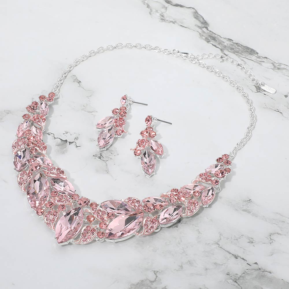 • Bold statement necklace and matching earring set designed to create a striking, elegant look. Featuring layered crystal accents arranged in a dramatic silhouette, this coordinated set enhances evening outfits, formal styling, and special occasion wear while delivering eye-catching sparkle and refined impact.