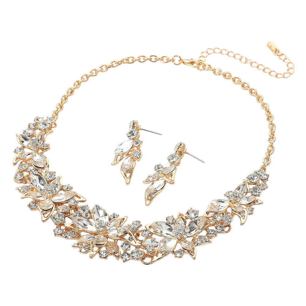 Details • Necklace Size : 18" + 4" L • Decor Size : 1.5" L • Earrings Size : 1.8" L • Elegant jewelry set featuring a floral-inspired statement necklace with matching drop earrings. Designed with sparkling gemstone details that add glamour and refinement. Perfect for weddings, parties, or special occasions, creating a radiant and sophisticated look. • Lead and Nickel Compliant