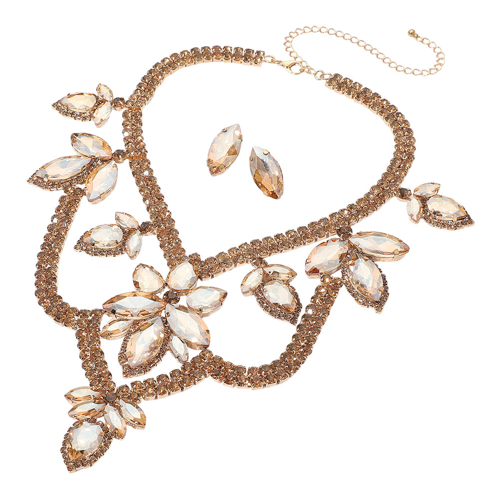 Details • Necklace Size : 15.5" + 7" L • Decor Size : 5" L • Earring Size : 1" L • Elegant statement bib necklace and earring set featuring sparkling crystal leaf clusters and layered detailing for a glamorous, eye-catching finish. Perfect for evening events, formals, weddings, and special occasions, adding radiant shine and dramatic sophistication to any standout look.