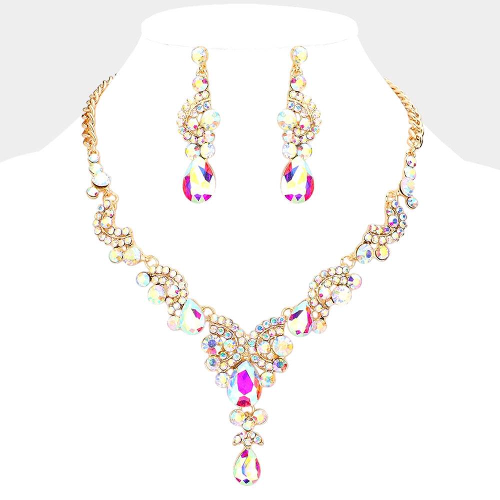 • Stunning teardrop crystal necklace and earring set designed with intricate clustered detailing and sparkling stones. Features a graceful V-shaped centerpiece and matching drop earrings, perfect for formal events, weddings, parties, and special occasions. A glamorous statement set that elevates any outfit.