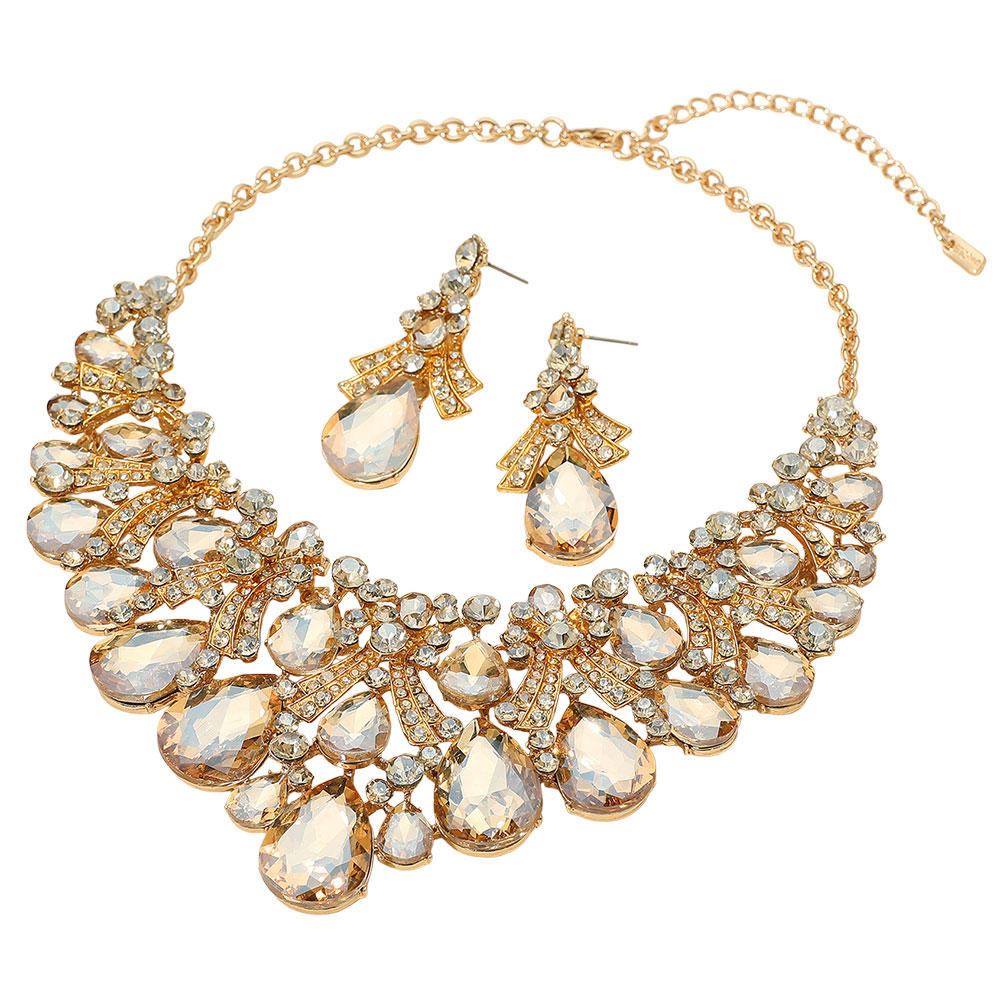• Make an unforgettable impression with this statement teardrop bib necklace and earring set. Adorned with an array of dazzling stones and intricate detailing, this bold jewelry set adds luxurious sparkle and sophistication—perfect for weddings, galas, and evening events.