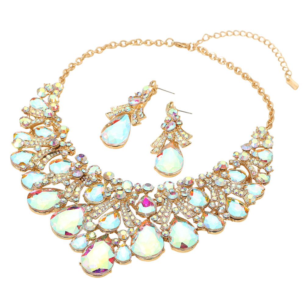 • Make an unforgettable impression with this statement teardrop bib necklace and earring set. Adorned with an array of dazzling stones and intricate detailing, this bold jewelry set adds luxurious sparkle and sophistication—perfect for weddings, galas, and evening events.