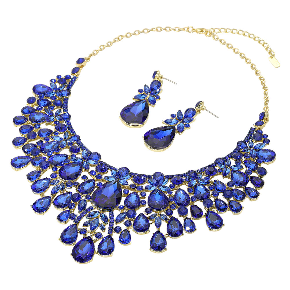 • Elevate your evening style with this bold teardrop necklace and earring set. Featuring an intricate array of faceted stones that shimmer with sophistication, this statement jewelry duo adds instant drama and elegance to any special occasion or formal ensemble.