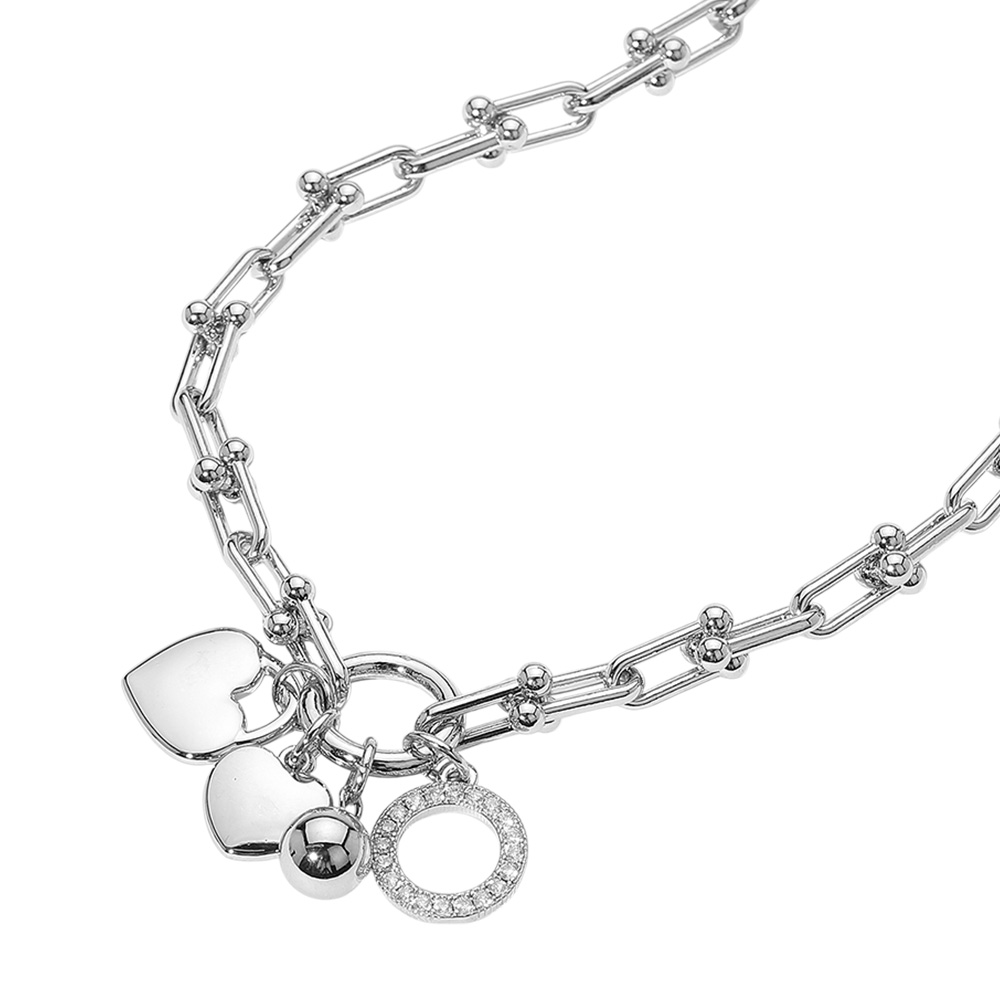 Details • Necklace Size : 17.5" + 3.75" L • Pendant Size : 1.7" L • Modern chunky chain necklace adorned with heart and circle charms, including a crystal-embellished pendant. A bold yet elegant statement piece perfect for everyday or evening wear. • Gold Dipped • CZ Cubic Zirconia