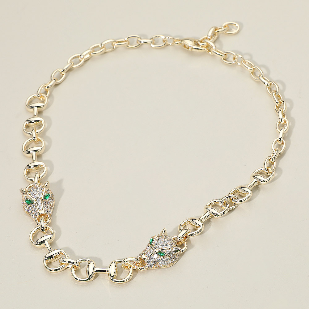 Details • Necklace Size : 18" + 2" L • Decor Size : 0.75" L • Stylish chain necklace featuring bold panther head motifs with sparkling cz accents and linked chain details. A striking statement piece designed to elevate any look with its fierce character and refined craftsmanship, perfect for gifting or adding standout charm to everyday style. • Gold Dipped • CZ Cubic Zirconia