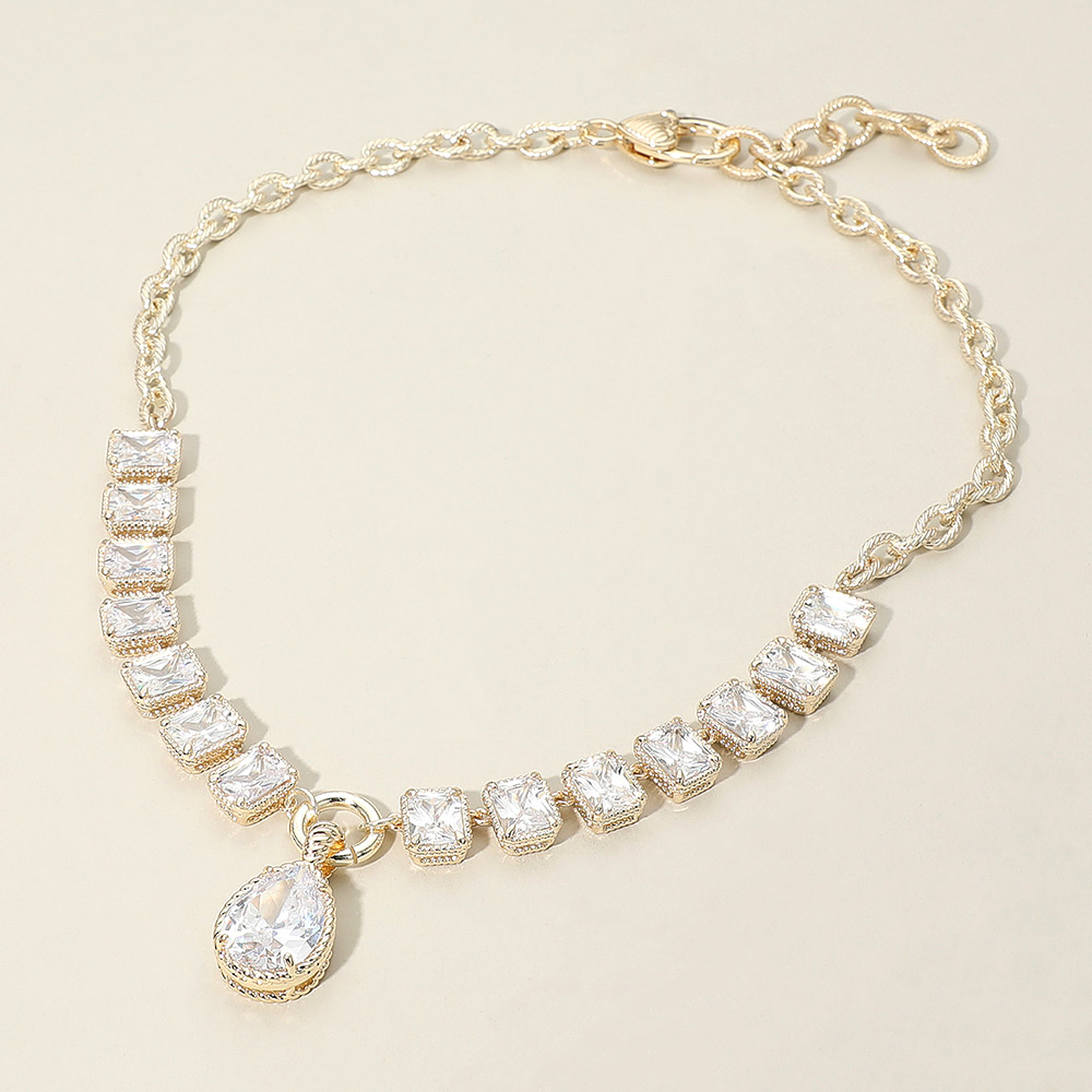 Details • Necklace Size : 17.5" + 2" L • Decor Size : 0.4" L • Pendant Size : 0.6" X 1.3" • Add show-stopping brilliance to your look with this radiant statement necklace featuring a row of cushion-cut stones and a pear-shaped drop charm. Its refined detailing and elegant sparkle make it perfect for special occasions or elevating everyday style with a touch of luxe sophistication. • CZ Cubic Zirconia • Gold Dipped