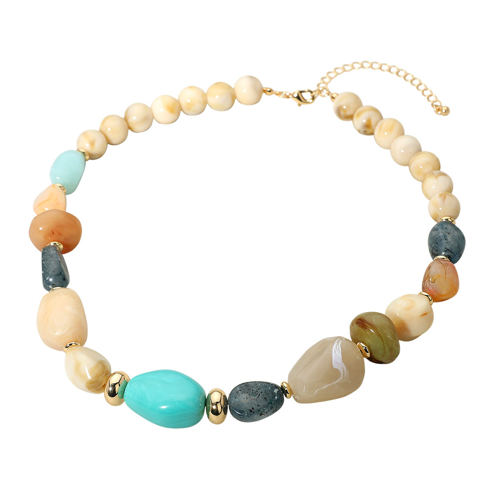 • Elevate your style with this 18" beaded necklace featuring a mix of smooth round and chunky polished stones. Accented with metallic spacers for added shine, this statement piece blends organic charm with modern elegance, making it perfect for everyday wear or special occasions.