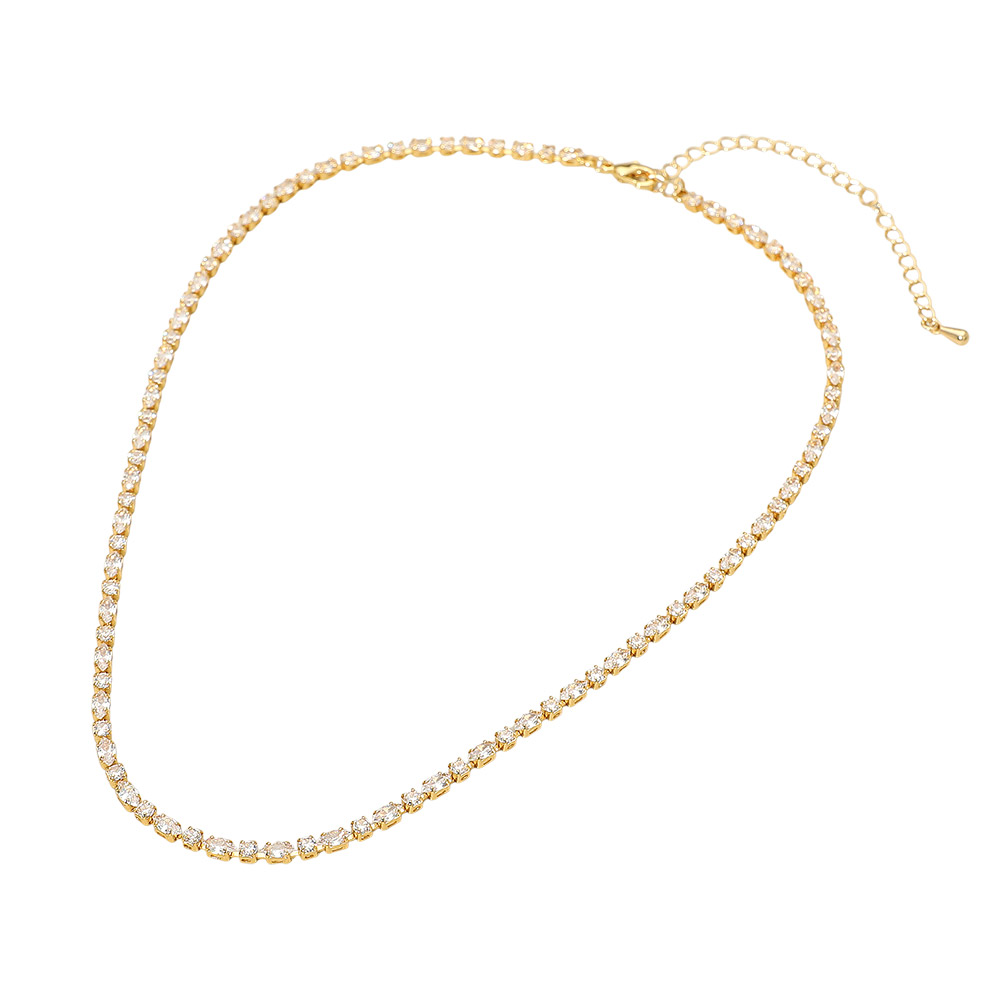 Details • Necklace Size : 16" + 3" L • Decor Size : 0.1" L • Timeless tennis chain necklace featuring perfectly aligned round and marquise crystals that catch the light beautifully. Ideal for adding elegance to casual or formal looks, this piece delivers effortless sophistication. A must-have accessory for refined, minimalist, and modern jewelry collections. • Gold Dipped • Lead and Nickel Compliant