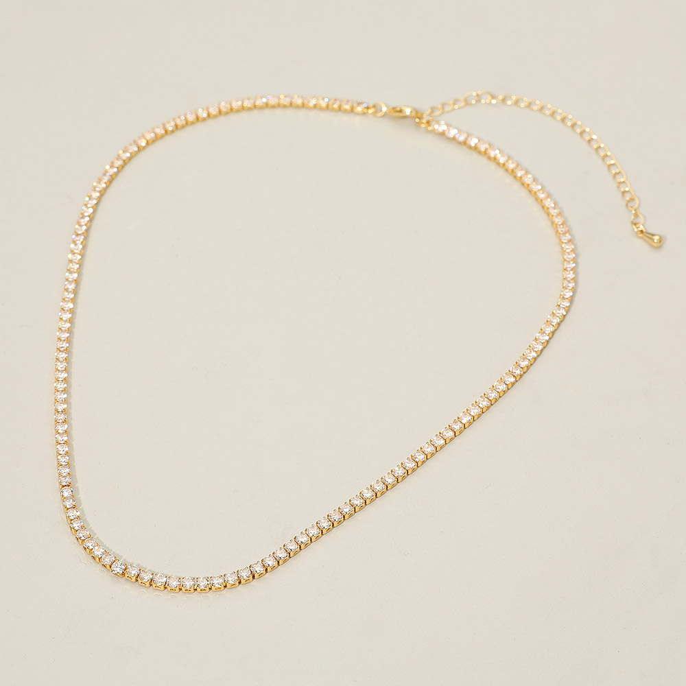 Details • Necklace Size : 16" + 3" L • Decor Size : 0.1" L • Refined tennis chain necklace featuring a row of sparkling crystal accents for a timeless and luxurious look. Perfect for layering or wearing solo, it enhances any outfit with subtle sophistication. Ideal for special occasions or daily elegance in any jewelry collection. • Gold Dipped • Lead and Nickel Compliant