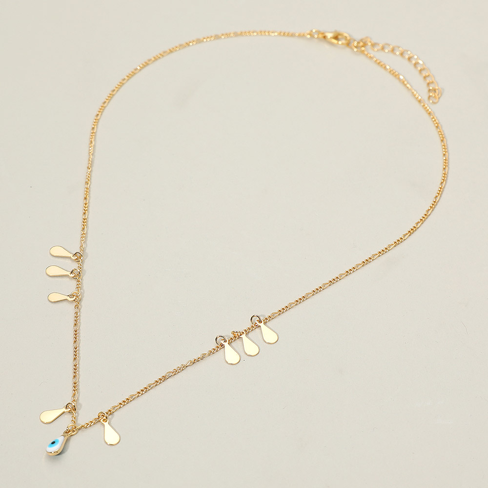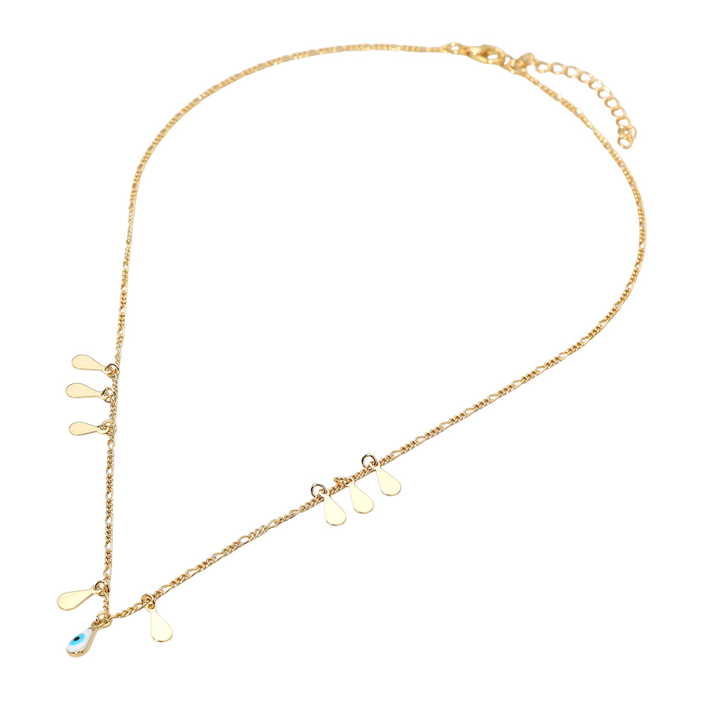 Details • Necklace Size : 16" + 2" L • Decor Size : 0.4" L • Chic teardrop charm necklace featuring a delicate chain adorned with small droplet accents and a subtle evil eye pendant. This elegant piece blends symbolic design with modern minimalism, making it a versatile accessory for everyday wear or layered jewelry styling. • Gold Filled • Lead and Nickel Compliant • Made In Brazil