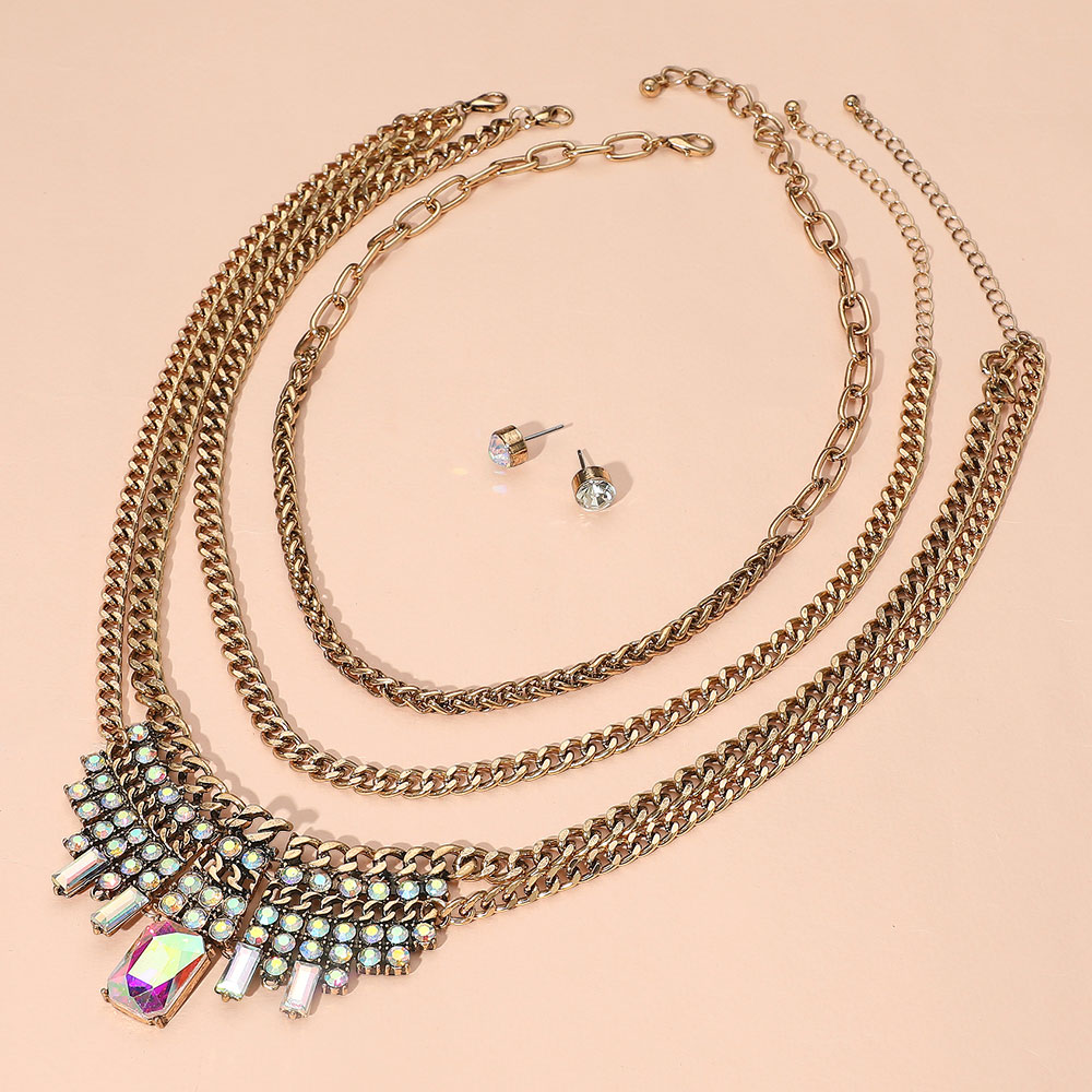 Details • Necklace 1 Size : 17" + 2.5" L, 0.25" L • Necklace 2 Size : 19" + 3.25" L, 1.75" L • Necklace 3 Size : 16.5" + 3.5" L, 0.25" L • Earrings Size : 0.3" L • Elevate your outfit with this striking multi-layer necklace featuring shimmering crystal details and matching studs. A bold, elegant accessory set perfect for special occasions or standout style moments. • Lead and Nickel Compliant