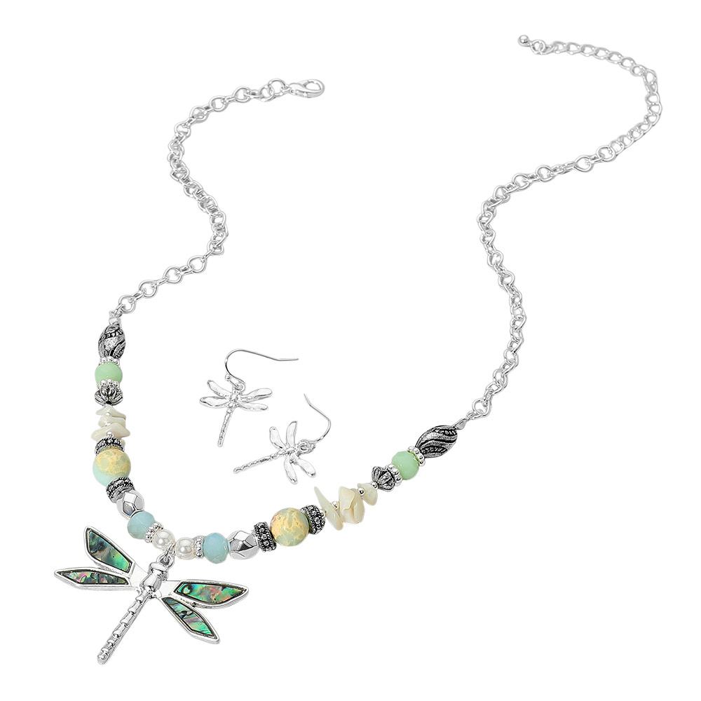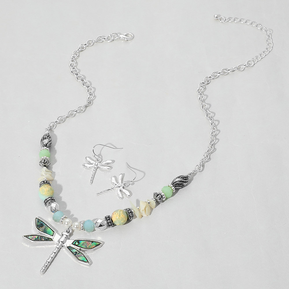 Details • Necklace Size : 18" + 3" L • Decor Size : 0.3" L • Pendant Size : 1.8" X 1.4" • Earrings Size : 1.25" L • Elegant jewelry set featuring a dragonfly pendant necklace with matching earrings and a mix of decorative beads. Perfect for adding a whimsical, nature-inspired accent to any outfit or occasion. • Lead and Nickel Compliant