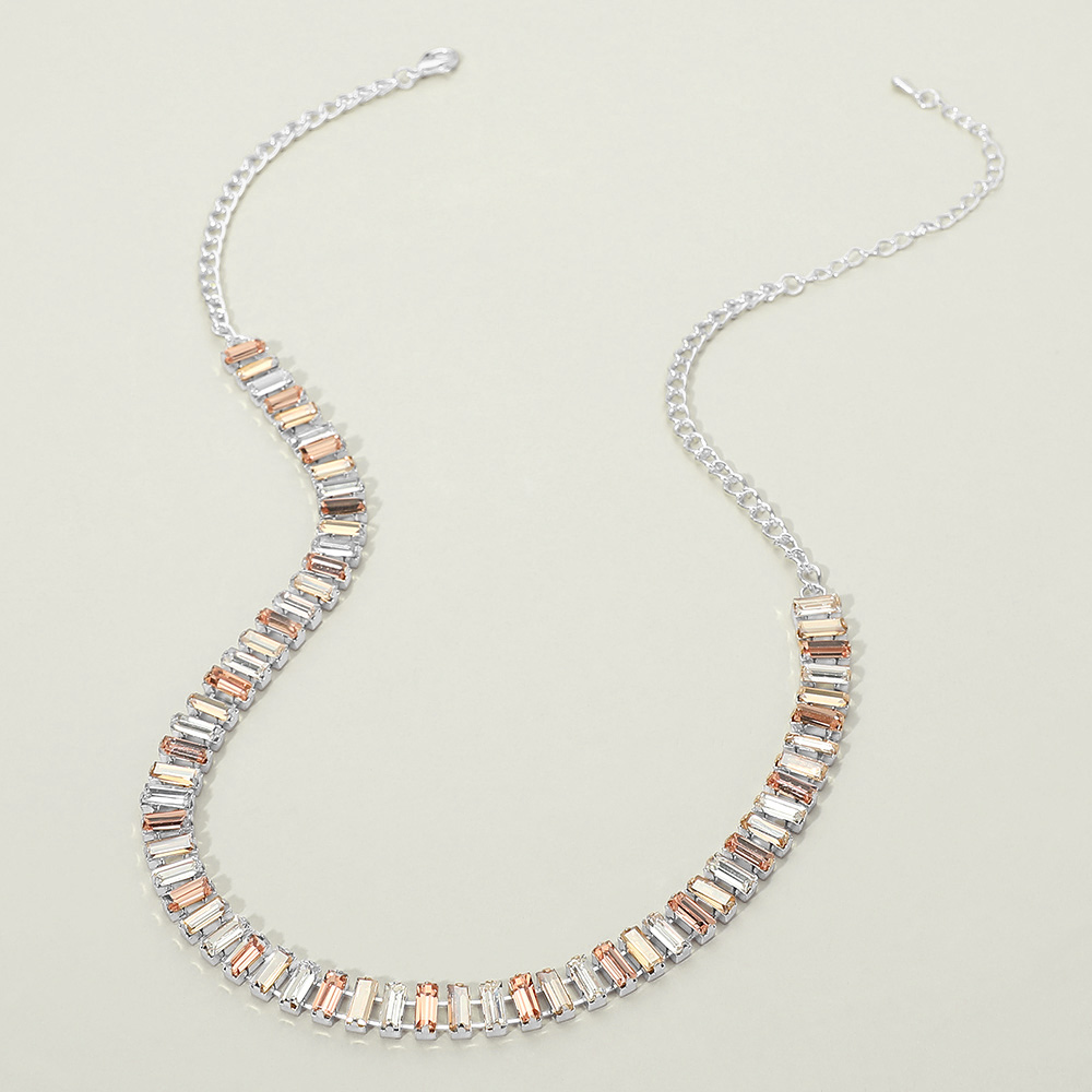 Details • Necklace Size : 18.25" + 3" L • Decor Size : 0.3" L • This statement necklace features a sleek row of baguette style accents arranged along a classic chain for a refined yet eye catching look. Designed to elevate everyday outfits or complete evening styling, it offers a balanced blend of structure and shine. Ideal for layered looks, gift selections, and curated accessory assortments. • Lead and Nickel Compliant