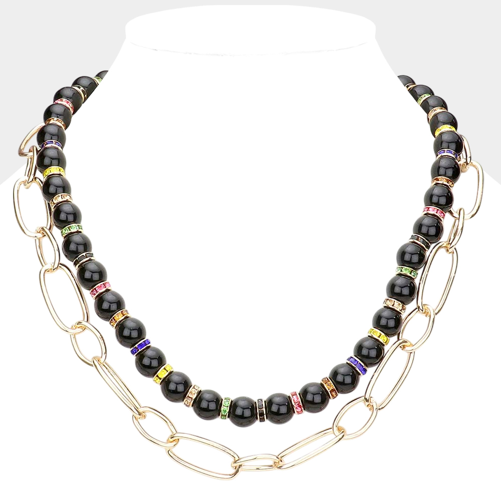 Beaded Open Metal Oval Link Double Layered Necklace