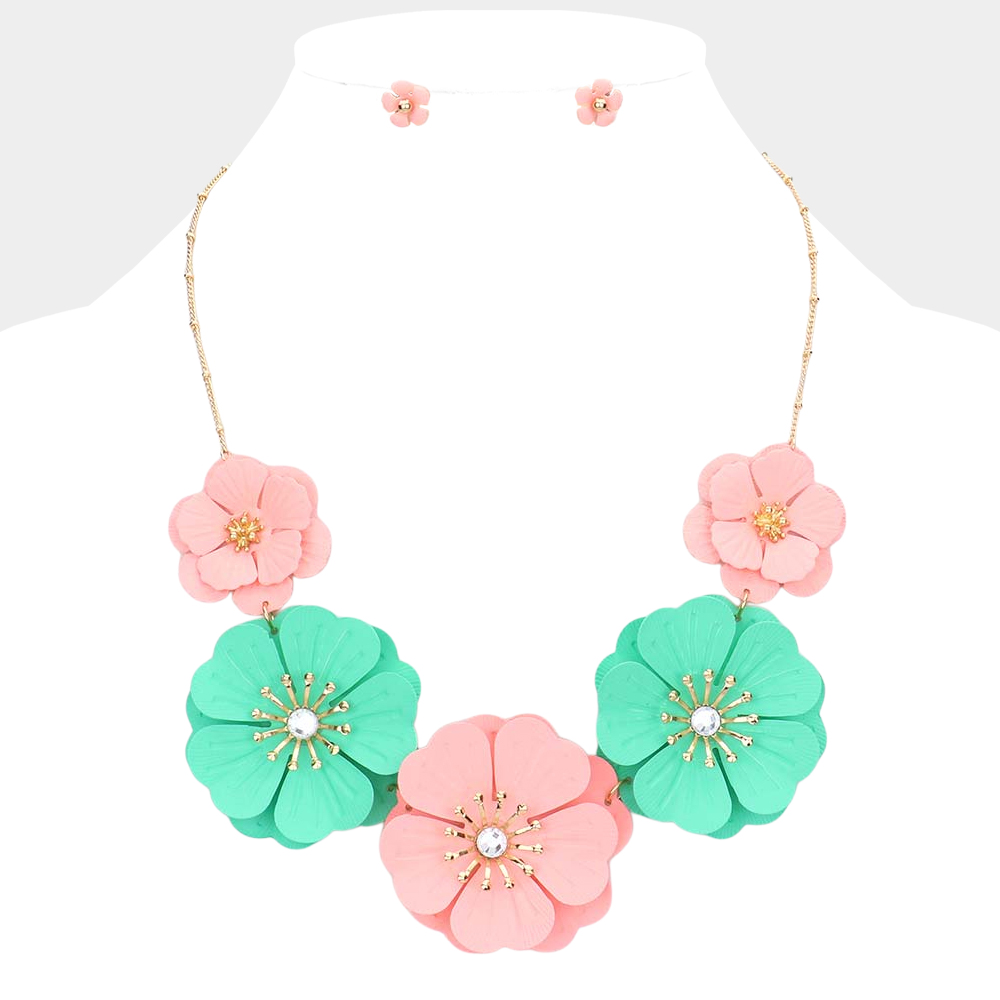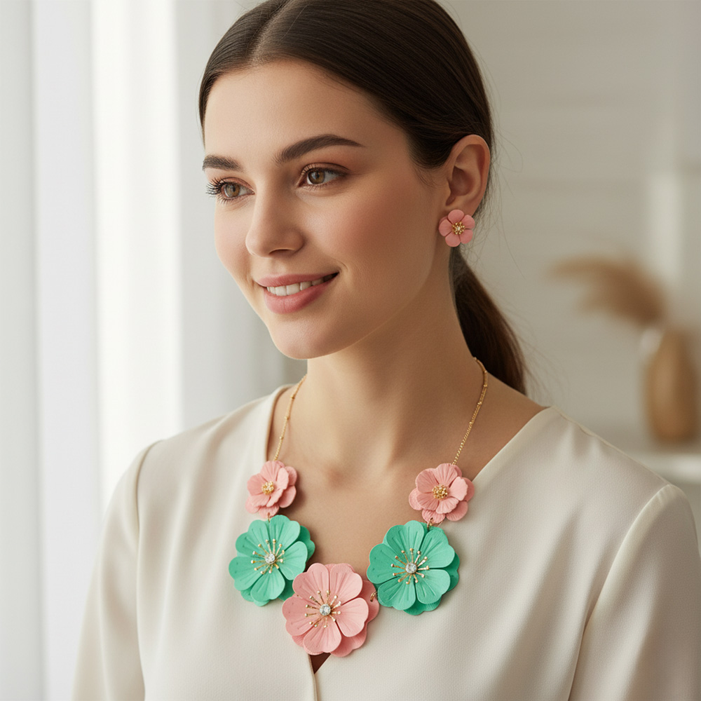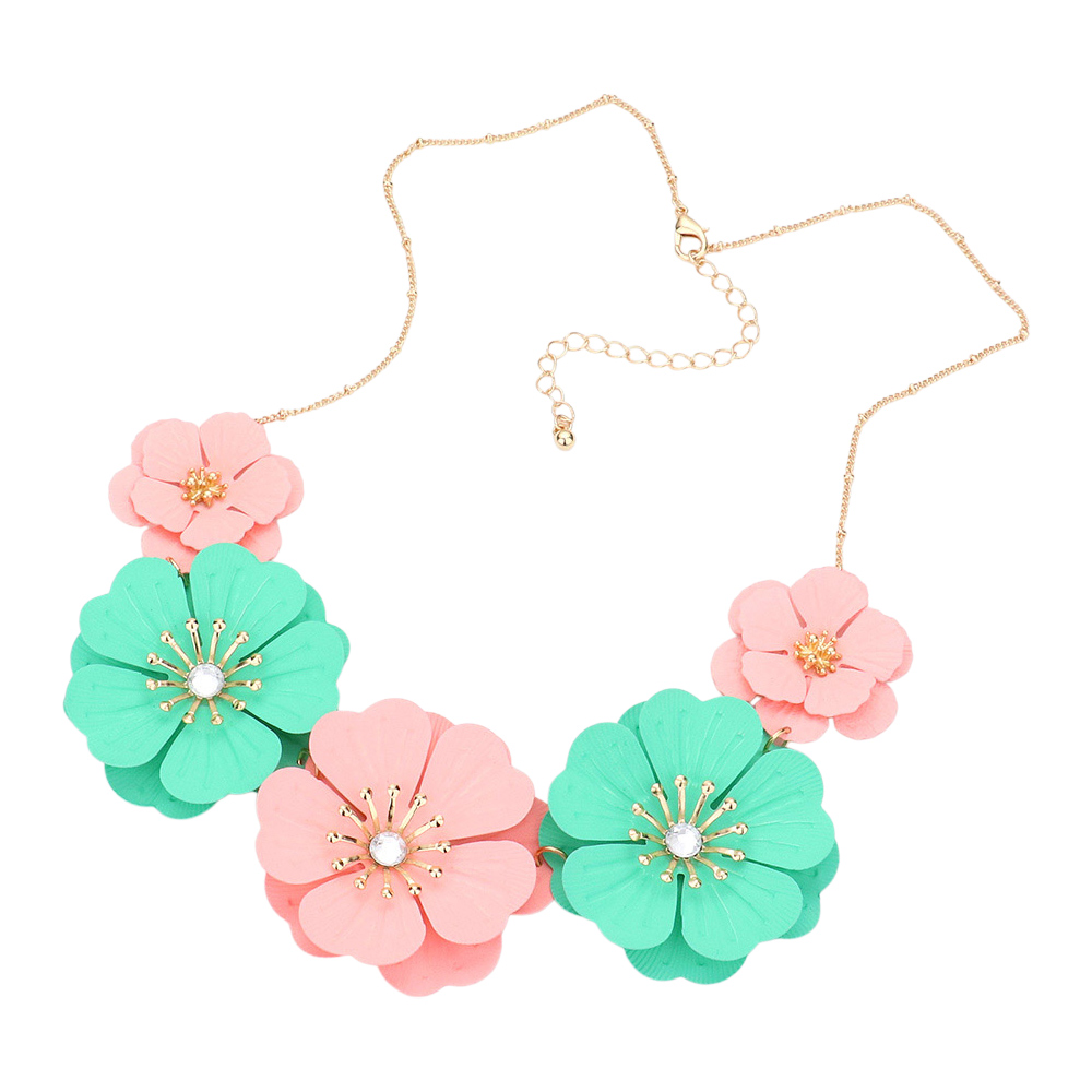 Enamel Heart Pendant Flower Link Double Layered Necklace