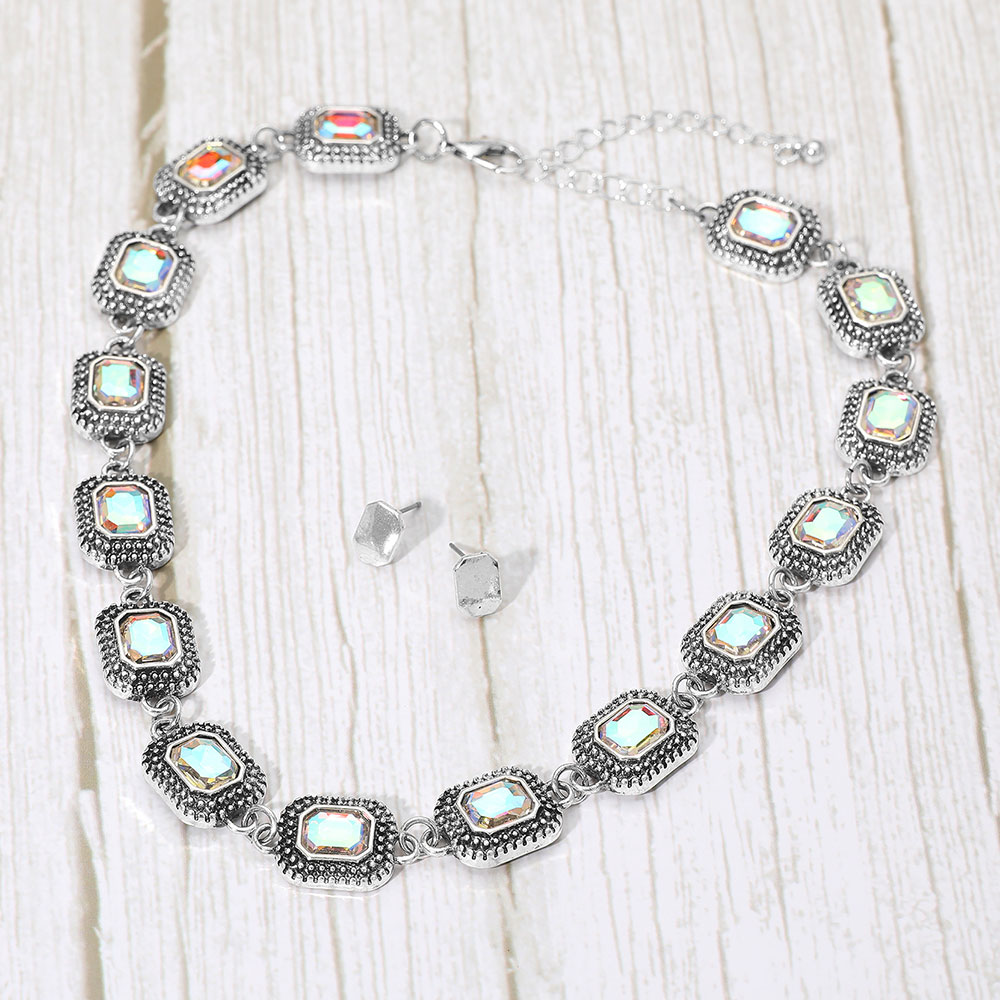 Details • Necklace Size : 17" + 3" L • Decor Size : 0.6" L • Earrings Size : 0.4" L • This iridescent gem necklace and earring set features dazzling rectangular stones framed in intricate vintage-inspired settings. Designed to reflect light beautifully, it adds timeless sparkle to any look, making it perfect for both special occasions and elegant everyday wear. • Lead and Nickel Compliant