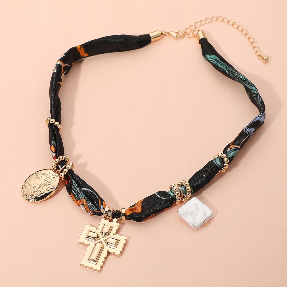 Boho Metal Cross Square Pearl Floral Oval Charm Fabric Necklace