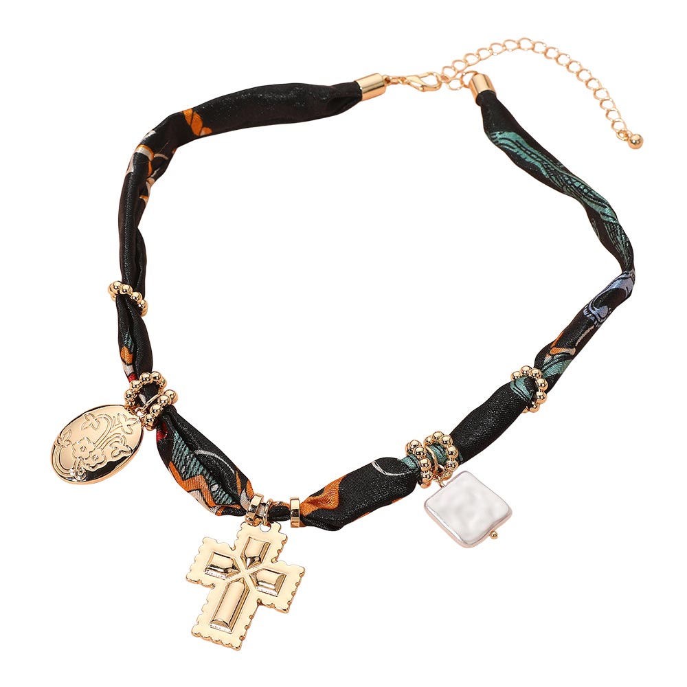 • Make a bold fashion statement with this Charm Pendant Fabric Necklace, featuring a twisted fabric band accented with shimmering beads, a cross charm, and elegant pendants. Perfect for adding a touch of sophistication and individuality to your casual or evening ensembles.