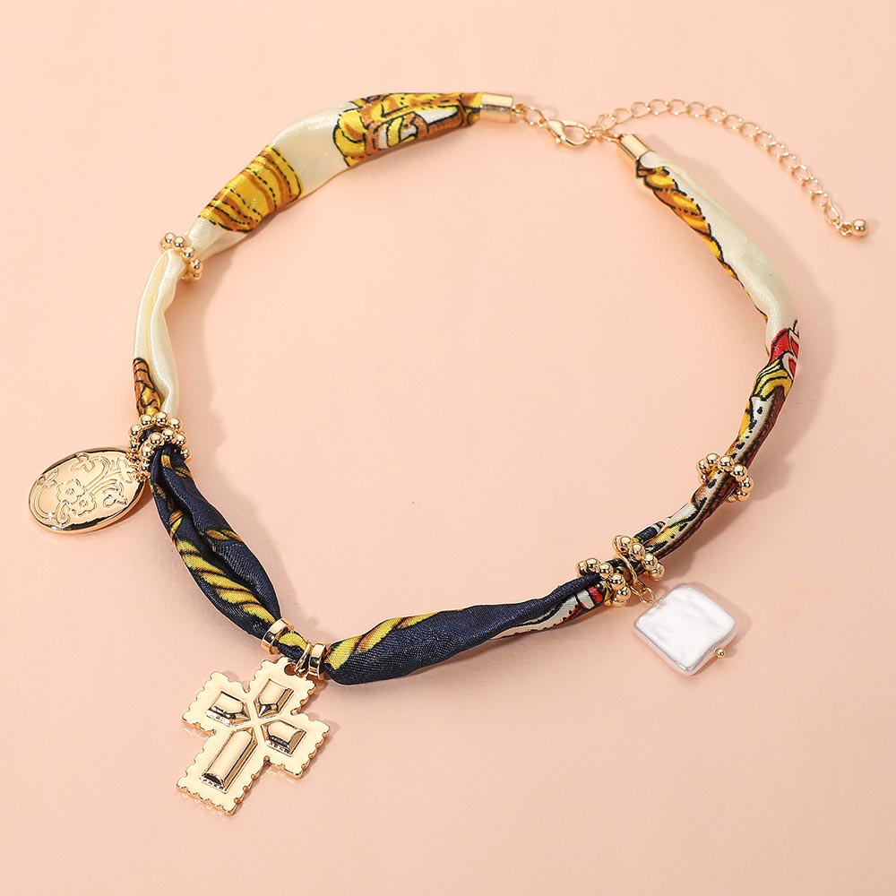 Boho Metal Cross Square Pearl Floral Oval Charm Fabric Necklace Boho Metal Cross Square Pearl Floral Oval Charm Fabric Necklace