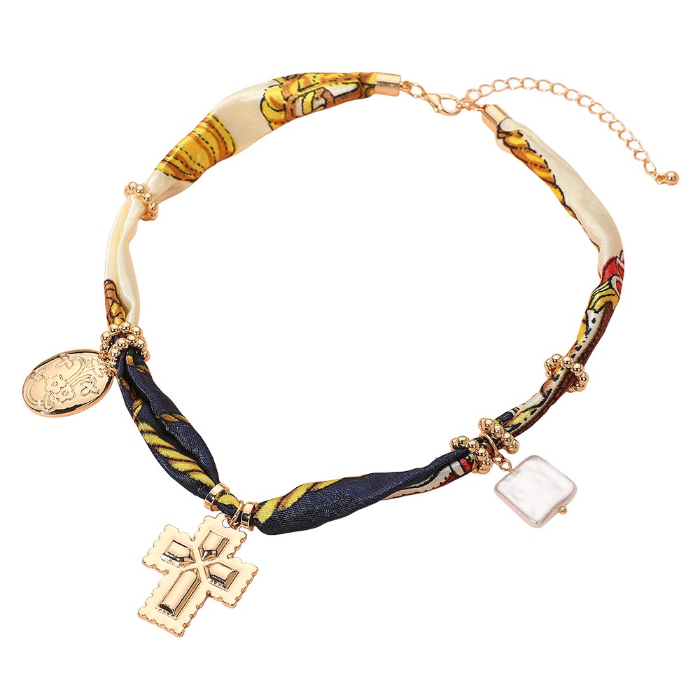 • Make a bold fashion statement with this Charm Pendant Fabric Necklace, featuring a twisted fabric band accented with shimmering beads, a cross charm, and elegant pendants. Perfect for adding a touch of sophistication and individuality to your casual or evening ensembles.