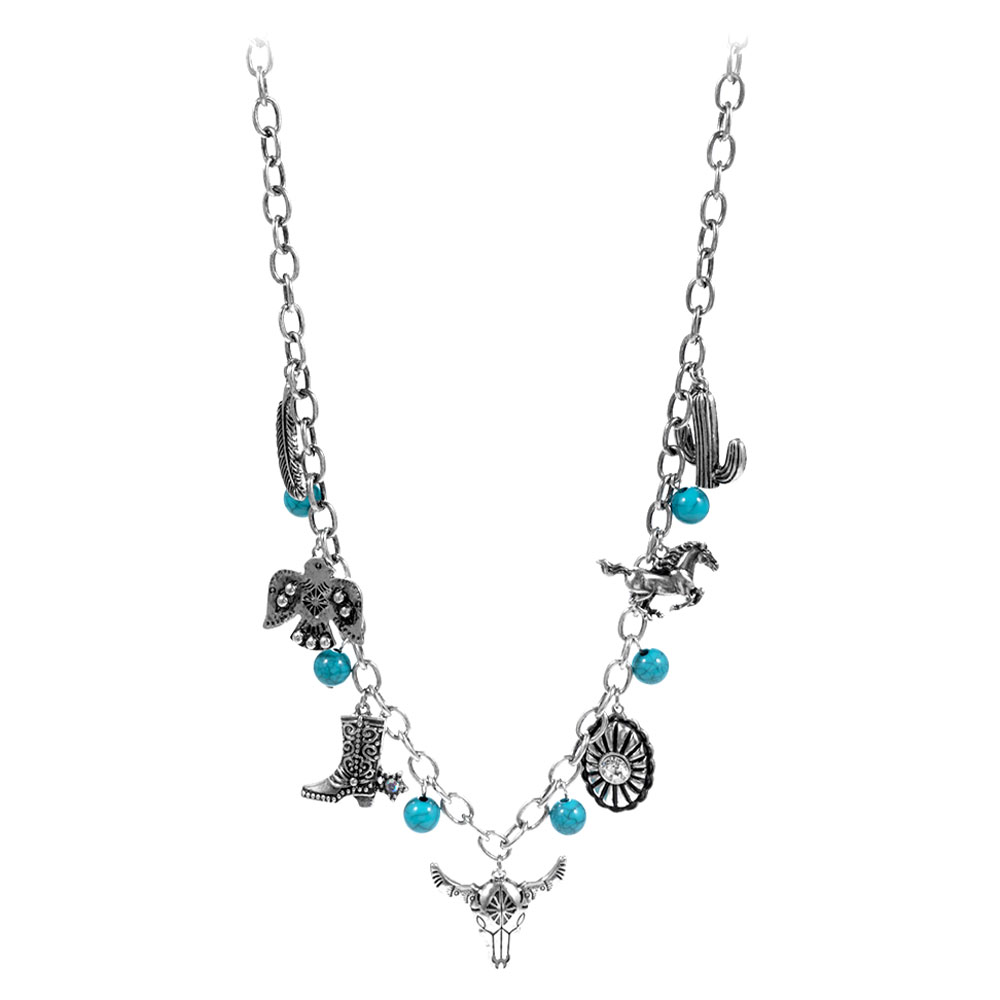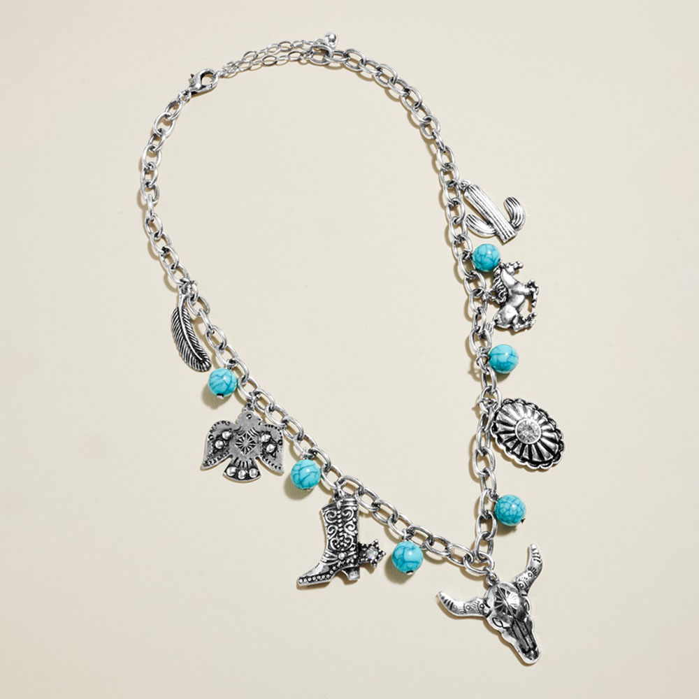 Details • Necklace Size : 18" + 3.5" L • Decor Size : 1.75" L • Statement necklace featuring a chain-style design accented with multiple themed charms and bead details. Ideal for adding playful personality to everyday outfits or party looks, this eye-catching accessory delivers a bold, layered aesthetic with versatile styling appeal. • Lead and Nickel Compliant