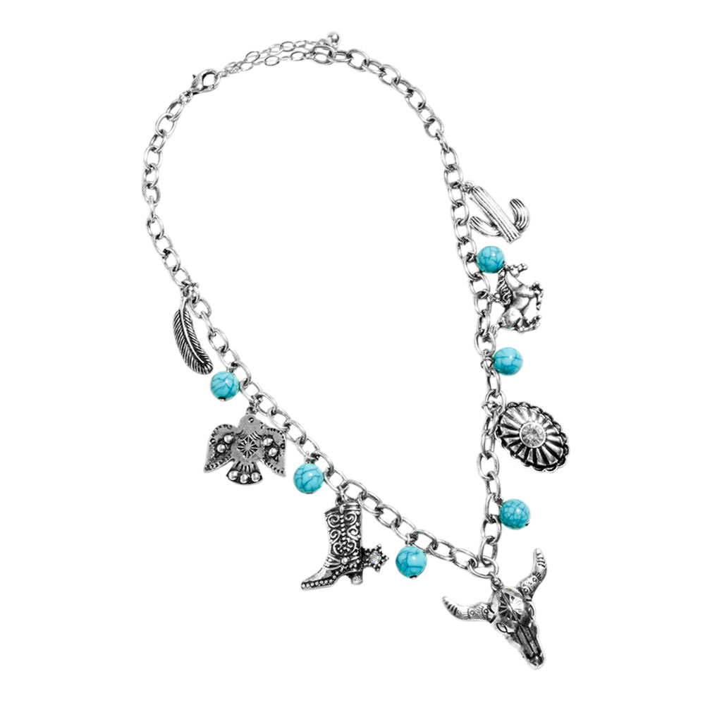 Boho Western Cowboy Boot Steer Head Cactus Concho Feather Charm Station Bracelet