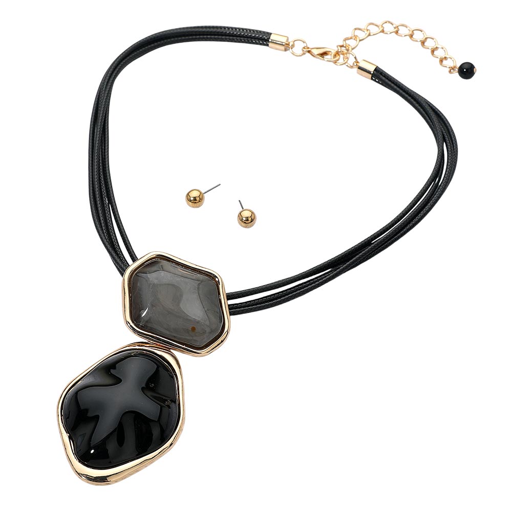 • Bold pendant necklace paired with coordinating stud earrings for a complete look. The unique layered design adds eye-catching detail, making this set perfect for elevating casual outfits or complementing evening attire with effortless elegance.