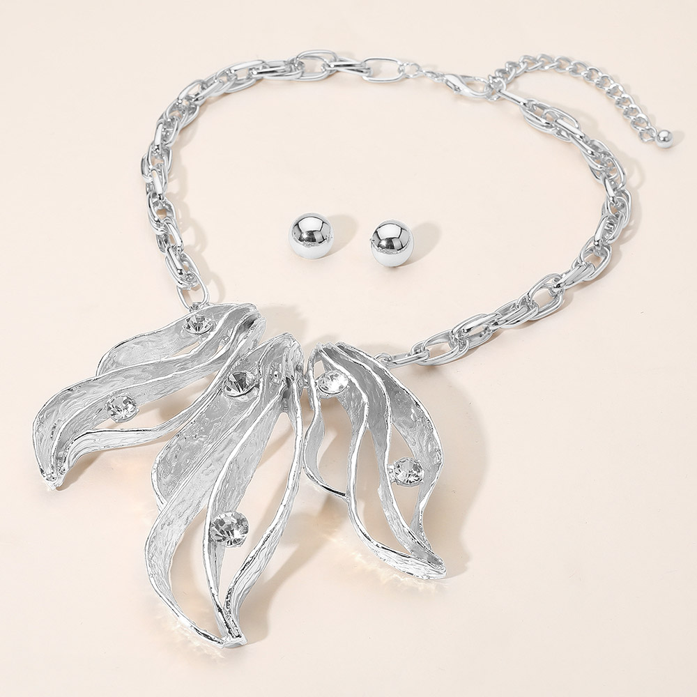 Details • Necklace Size : 18" + 3" L • Decor Size : 4" L • Earrings Size : 0.5" L • This abstract leaf statement necklace set captures artistic sophistication with its sculpted openwork design and sparkling crystal accents. Paired with simple stud earrings, it creates a balanced, elegant look perfect for formal occasions or adding a refined touch to everyday style. • Lead and Nickel Compliant