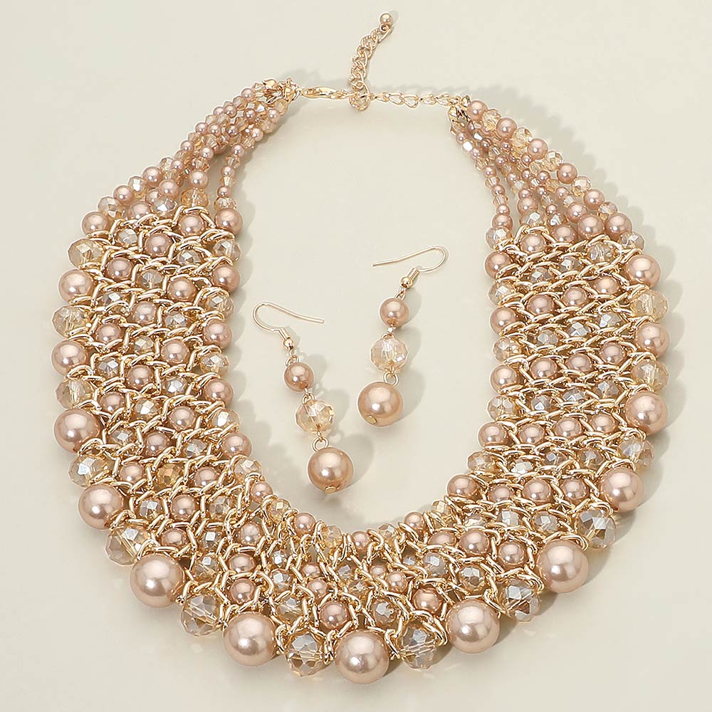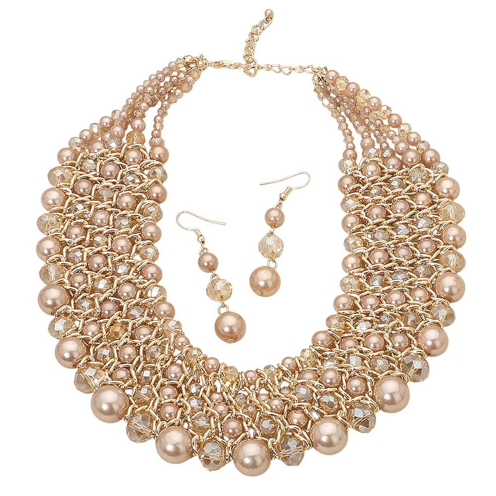 • Bold multi strand statement necklace set featuring layered beads accents with matching drop earrings. Designed to elevate formal looks, evening outfits, and special occasion styling. A boutique-ready jewelry set that adds dimension, texture, and elegant impact to dresses, blouses, and event wear collections.
