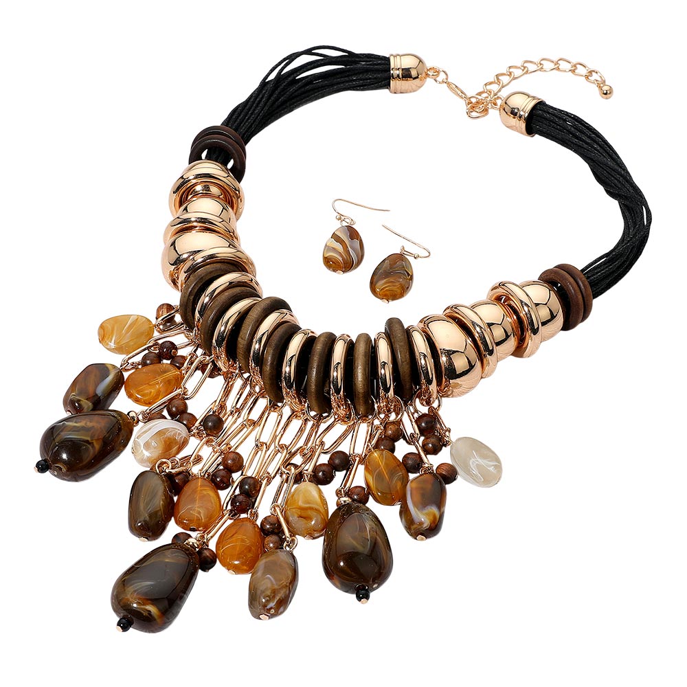Details • Necklace Size : 16.5" + 3" L • Decor Size : 4.5" L • Earrings Size : 1.2" L • Elevate your style with this layered bead necklace and earring set featuring sculpted rings, polished details, and cascading charms. Its dramatic mix of shapes and textures adds artistic depth and movement, creating a striking statement piece perfect for standout everyday looks or special occasions. • Lead and Nickel Compliant
