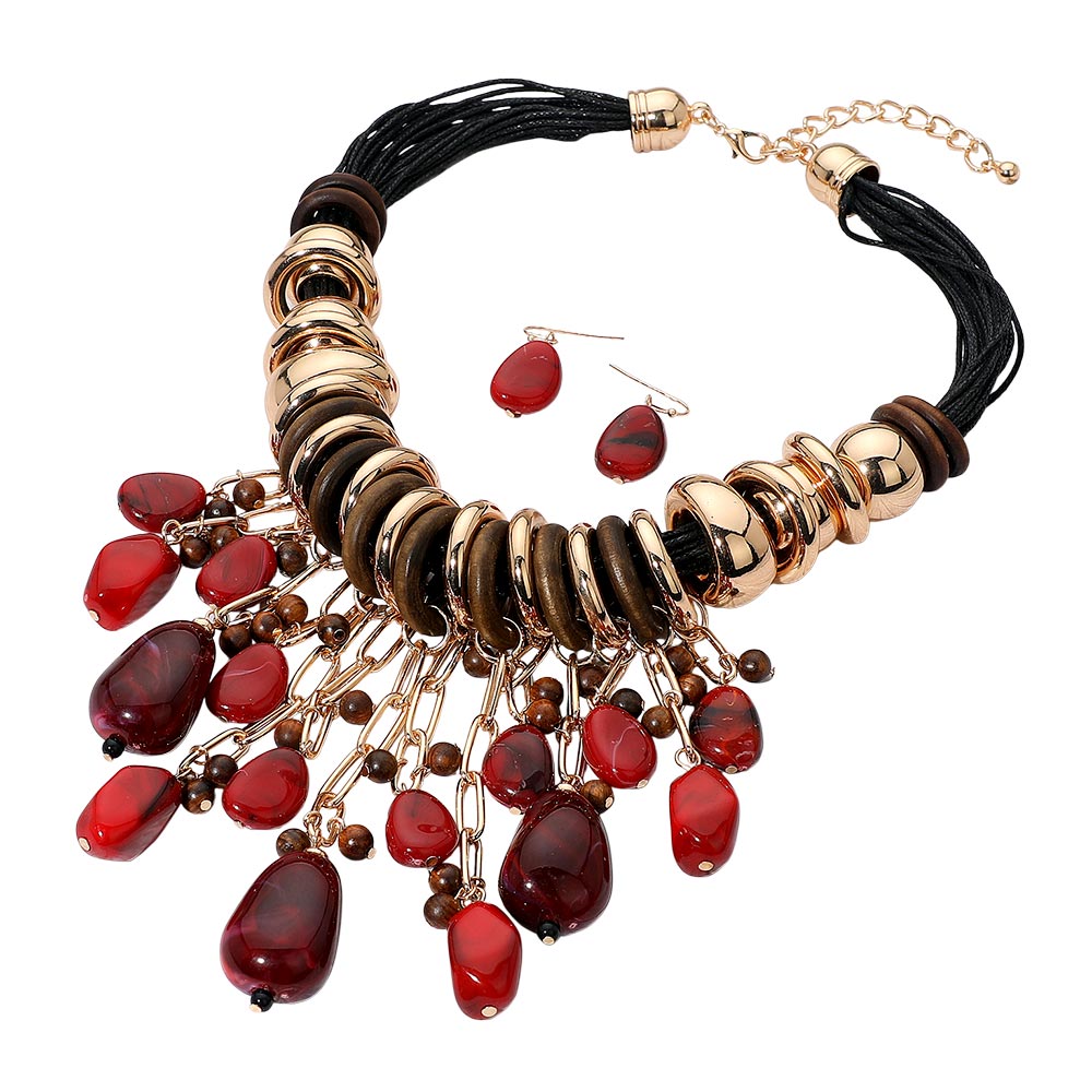 Details • Necklace Size : 16.5" + 3" L • Decor Size : 4.5" L • Earrings Size : 1.2" L • Elevate your style with this layered bead necklace and earring set featuring sculpted rings, polished details, and cascading charms. Its dramatic mix of shapes and textures adds artistic depth and movement, creating a striking statement piece perfect for standout everyday looks or special occasions. • Lead and Nickel Compliant