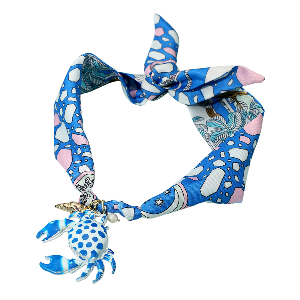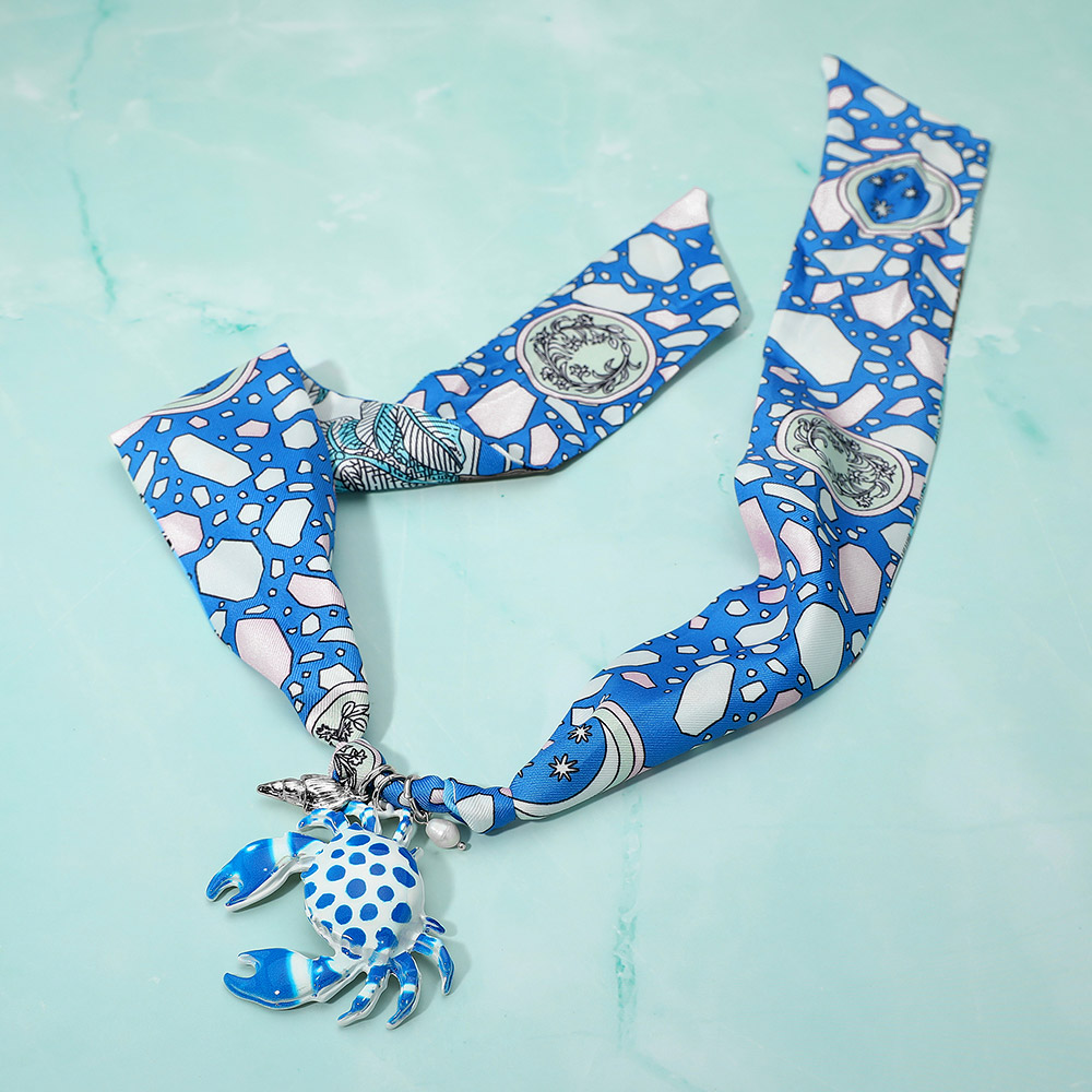 Details • Necklace Size : 31" L / Adjustable • Pendant Size : 2.25" X 2.8" • Print May Vary • Playful scarf necklace featuring a patterned fabric tie with a bold crab pendant, seashell accent, and pearl detail. Adjustable and eye-catching, this fun accessory adds a coastal-inspired statement to any casual or vacation outfit. • Lead and Nickel Compliant