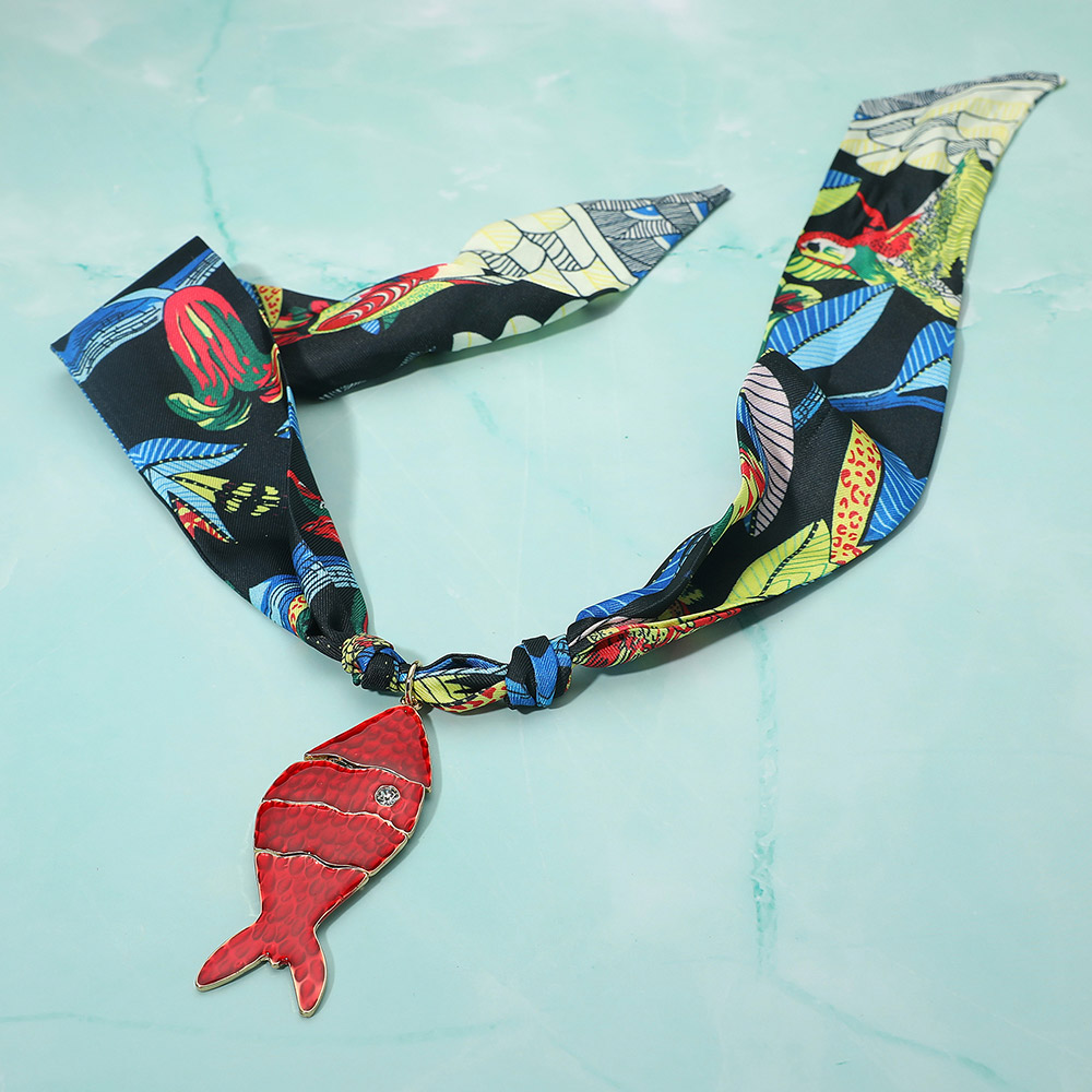 Details • Necklace Size : 30" L • Pendant Size : 1.4" X 3.4" • Print may vary • Make a statement with this unique scarf necklace featuring a colorful patterned fabric tied with a bold red fish pendant. Perfect for beachwear, summer outfits, or festival looks, this ocean-inspired accessory combines playful charm with stylish versatility for a standout coastal jewelry piece. • Lead and Nickel Compliant