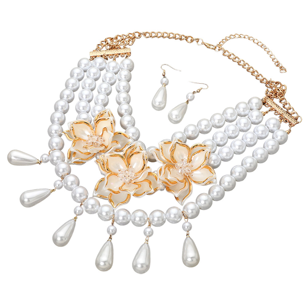 Details • Necklace Size : 20.5" + 4" L • Decor Size : 5.5" L • Earrings Size : 2.3" L • A bold statement set featuring layered beads, sculpted floral accents, and elegant drop details. Its intricate multi-strand silhouette and coordinated earrings elevate both formal and everyday looks, offering a refined accessory with standout charm. • Lead and Nickel Compliant