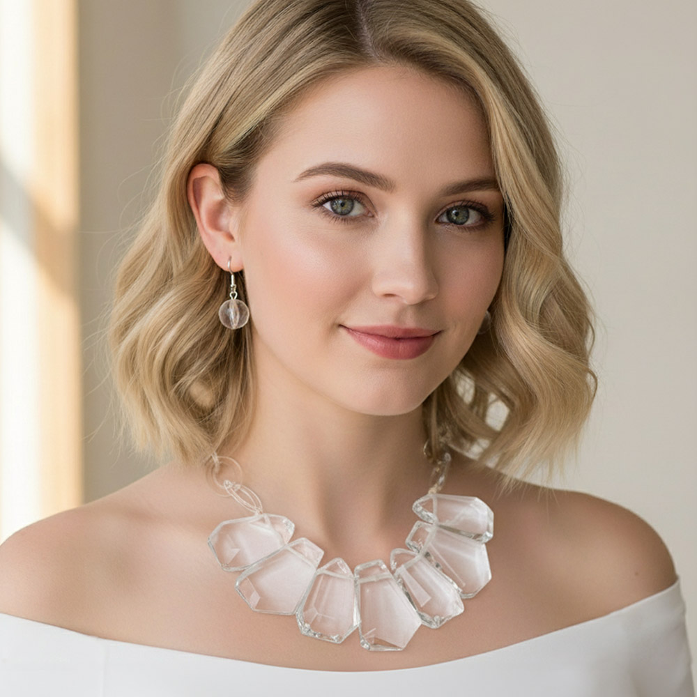 • Bold statement jewelry set featuring a geometric necklace with matching drop earrings. Designed with faceted shapes and linked details, this modern set adds artistic elegance, perfect for elevating evening looks or enhancing everyday outfits with a touch of contemporary style.