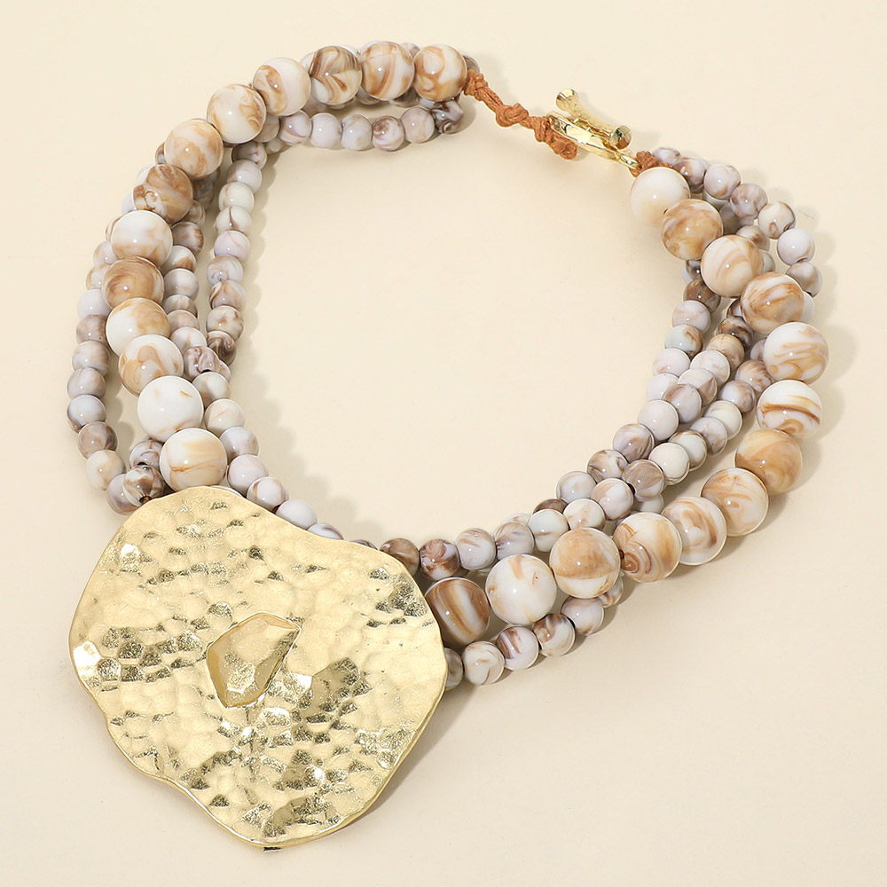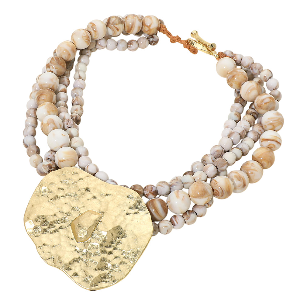 Details • Necklace Size : 19" + 1" L • Decor Size : 3.5" L • Eye-catching statement necklace designed with layered beaded strands and a bold textured pendant that creates depth and movement. This standout design offers a sculptural, fashion-forward look ideal for boutiques seeking unique statement jewelry that elevates everyday outfits, resort wear, and modern accessory collections. • Lead and Nickel Compliant