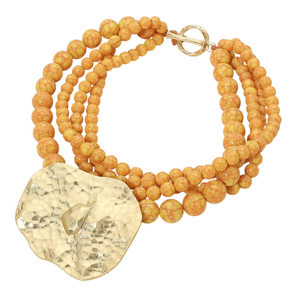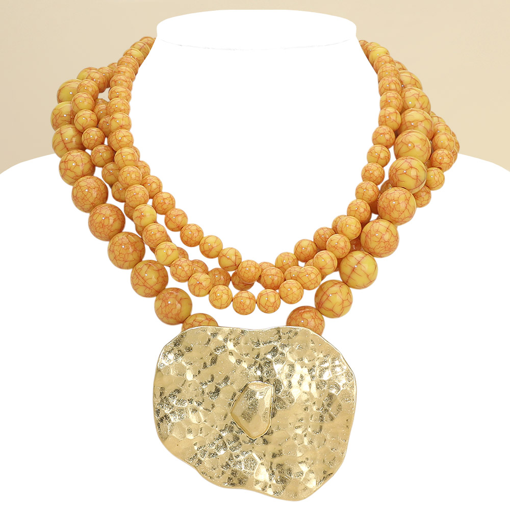 Details • Necklace Size : 19" + 1" L • Decor Size : 3.5" L • Eye-catching statement necklace designed with layered beaded strands and a bold textured pendant that creates depth and movement. This standout design offers a sculptural, fashion-forward look ideal for boutiques seeking unique statement jewelry that elevates everyday outfits, resort wear, and modern accessory collections. • Lead and Nickel Compliant