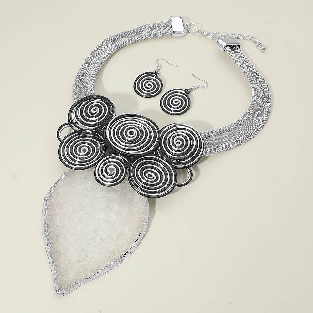 • This spiral pendant statement necklace set features layered circular wire accents paired with a bold centerpiece and coordinating drop earrings. Designed to create a modern artistic look, it adds strong visual impact and texture, making it ideal for boutiques seeking standout accessories for statement styling, special occasions, and elevated everyday outfits.
