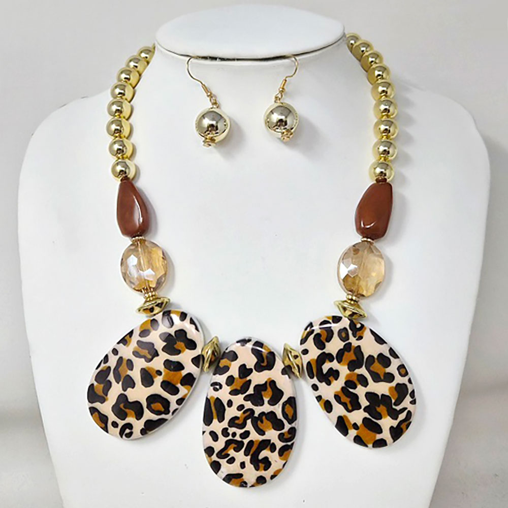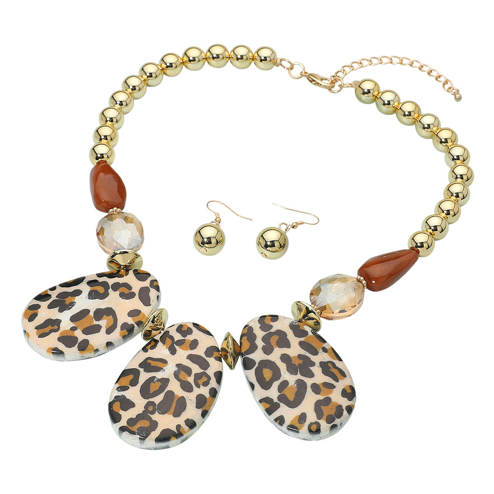 Details • Necklace Size : 20" + 3" L • Decor Size : 2.3" L • Earrings Size : 1.5" L • Turn heads with this bold statement necklace and earring set featuring striking animal print accents and polished beads. Designed for confidence and flair, this coordinated set brings a touch of wild sophistication to your wardrobe, perfect for parties or standout everyday looks. • Lead and Nickel Compliant