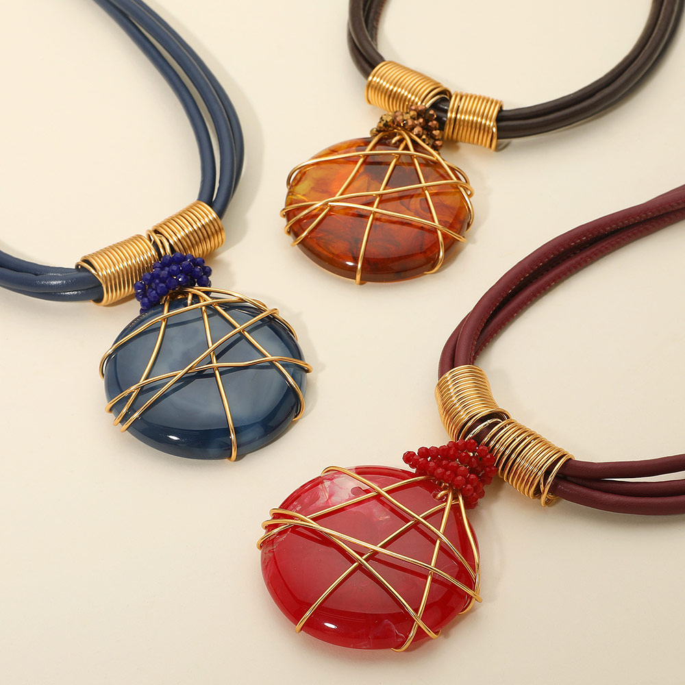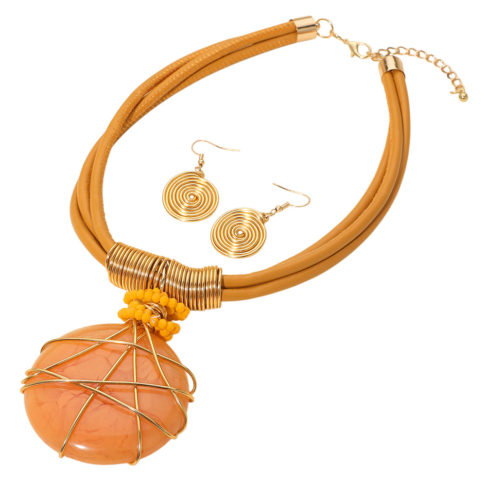 Details • Necklace Size : 19.25" + 3" L • Pendant Size : 2.75" X 3.5" • Earrings Size : 2.25" L • Make a striking impression with this bold statement necklace featuring a large round pendant wrapped in metallic accents and paired with matching spiral earrings. Perfect for elevating evening outfits or adding artistic flair to casual looks, this set is designed to turn heads with modern elegance. • Lead and Nickel Compliant