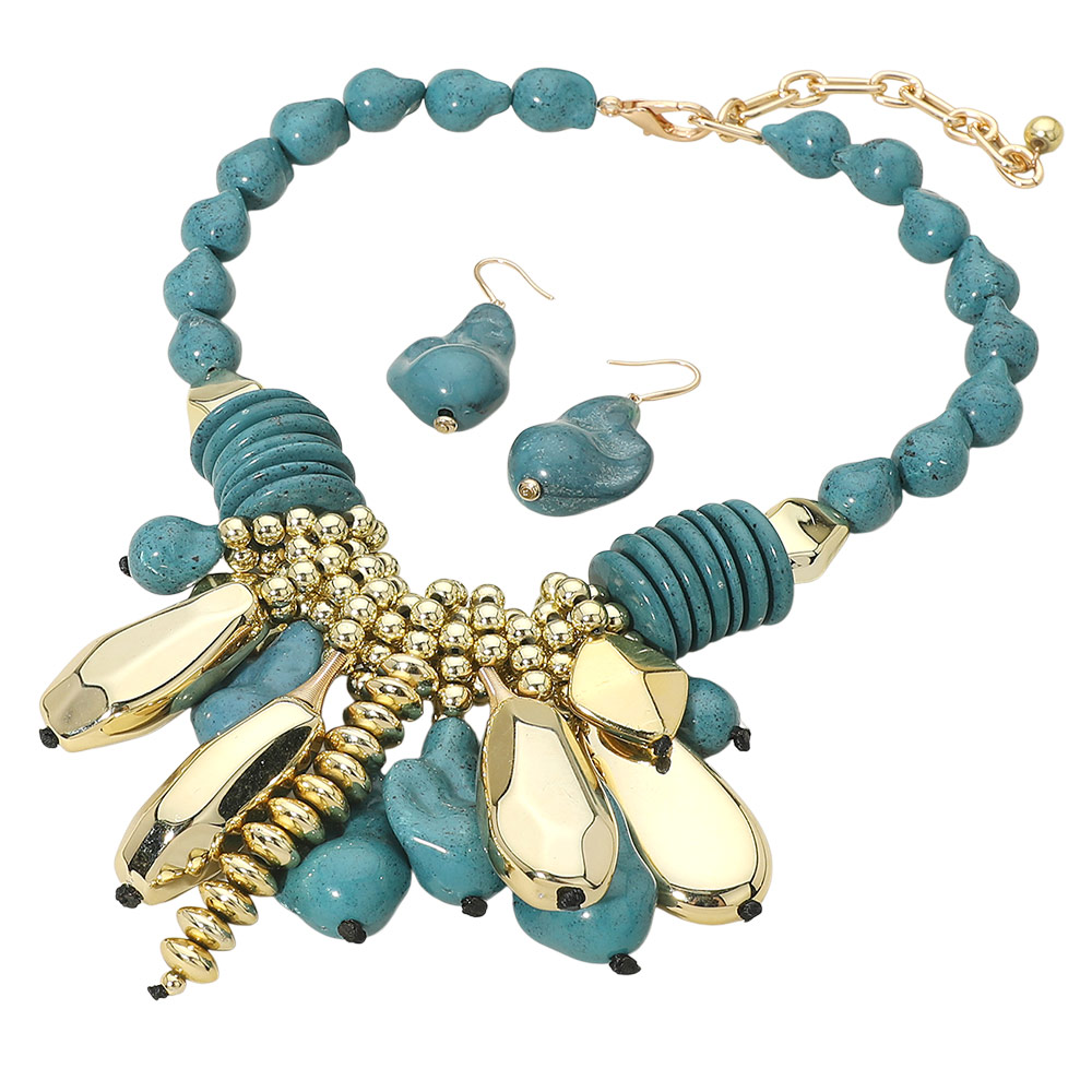 Details • Necklace Size : 17" + 3" L • Decor Size : 3.25" L • Earrings Size : 2.25" L • This statement charm necklace and matching earring set features layered beads and sculptural accents for a bold, fashion-forward look. Designed to elevate boutique collections, it offers strong visual impact, versatile styling options, and standout appeal for trend-driven outfits and modern statement jewelry displays. • Lead and Nickel Compliant